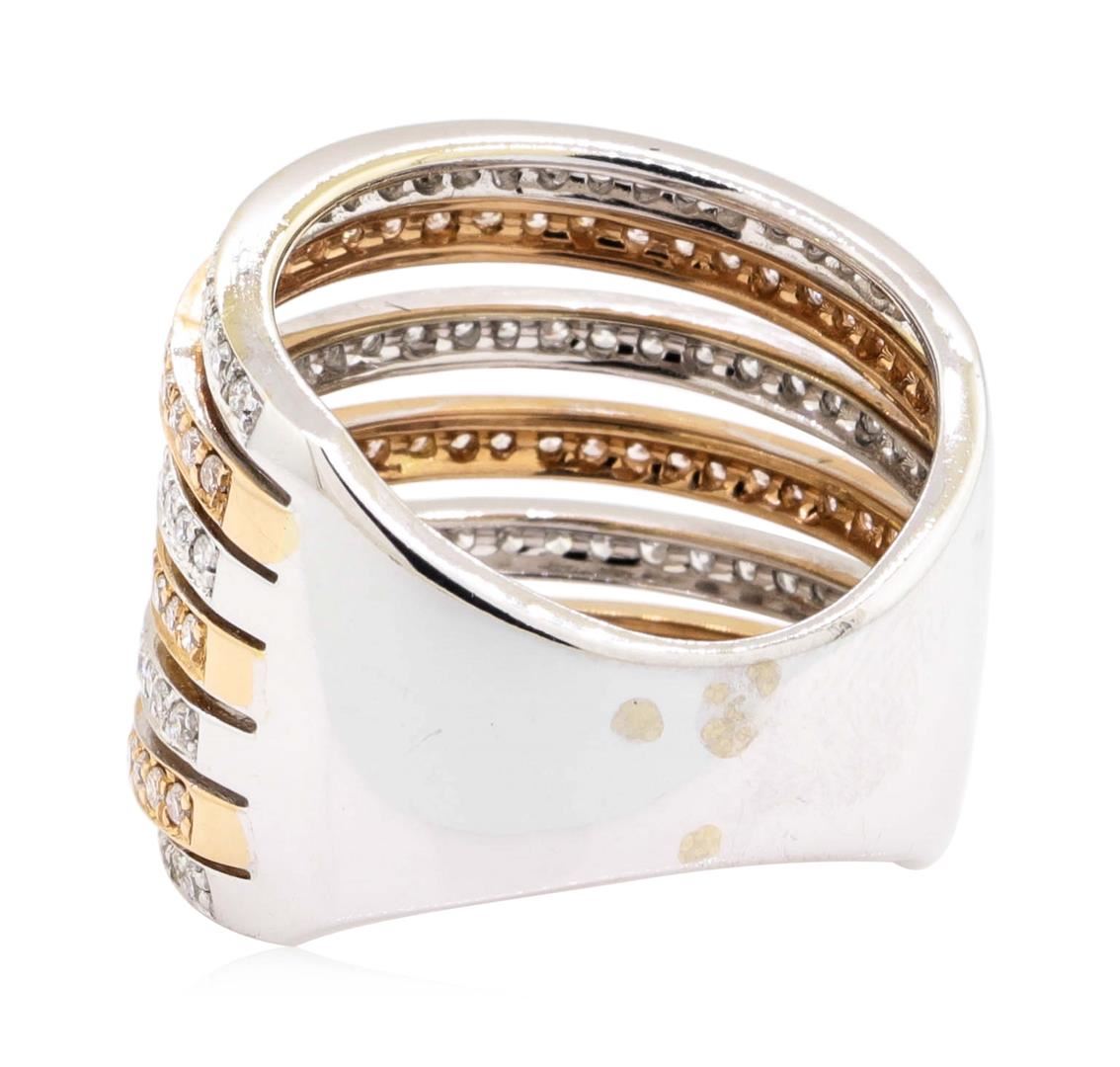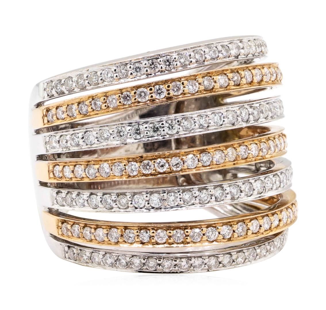 One electronically tested 18KT rose and white gold Ladies cast seven row straight line ring with a tapered shank with a bright polish finish. The featured ladies ring has a shank measuring 6.50 millimeters wide. Identified with markings of '18K'. Condition is new, good workmanship. Containing: One Hundred Seventy-Nine prong set round brilliant cut diamonds, measuring 1.30 - 1.20 x 0.75mm (depth est.) approximate total weight of 179 Stones = 1.23ct. Graded in the setting. Color H - I Clarity SI-1 to SI-2 Cut Good. Total Weight of Diamonds 1.23ct.. Total Weight of Ring 10.50gm. GAS Appraised.