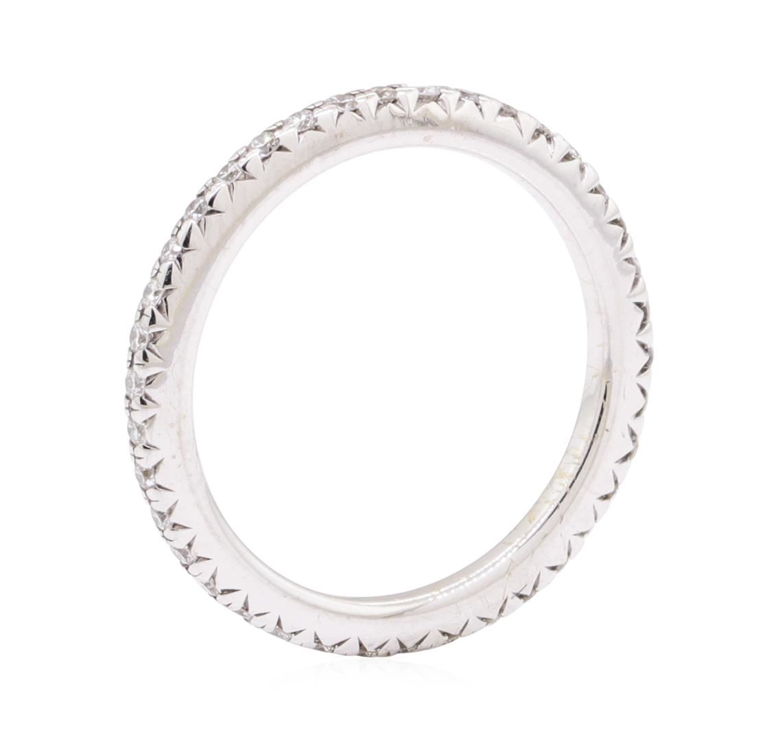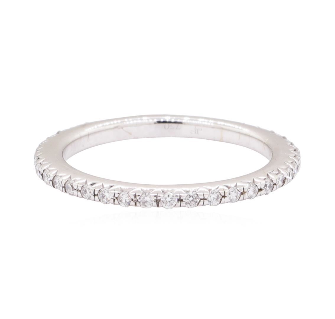 One eternity lady's ring featuring: 18KT white gold weighing 2.0 grams containing one blue sapphire set on the inside of the ring and diamonds weighing 0.50ctw. The ring is a size 4.5.