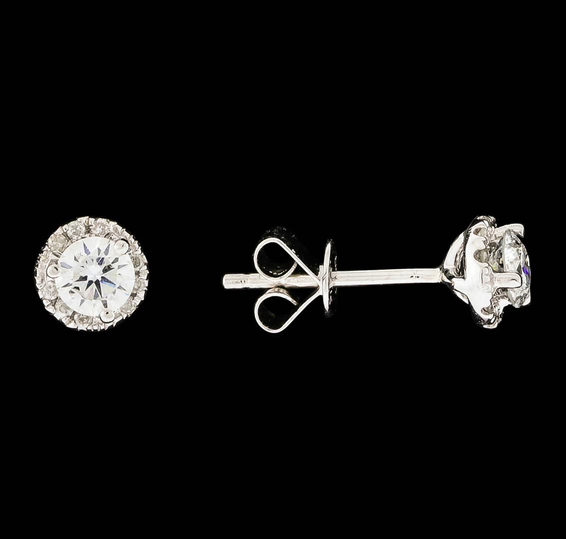 One pair electronically tested 18KT white gold cast & assembled diamond earrings with standard backs. Each earring features a diamond set within a diamond bezel. Bright polish finish. Condition is new, good workmanship. Containing: Two prong set round brilliant cut diamonds (depth est.) approximate total weight of 2 Stones = 0.43ct. Graded in the setting. Clarity: SI-2. Color: F - G Eighteen prong set round brilliant cut diamonds approximate total weight of 18 Stones = 0.07ct. Graded in the setting. Clarity: I-1 to I-2. Color: G - H. Total Weight of Diamonds 0.50ct. Total Weight of Earrings 1.22gm. AIG Appraised at $2,785.00.