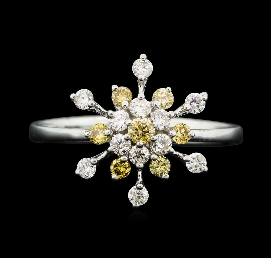 One lady's ring featuring: 18KT white gold weighing 2.8 grams containing nineteen yellow and white diamonds weighing 0.56ctw.