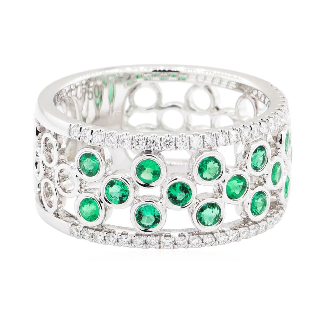 One electronically tested 18KT white gold Ladies combination cast & assembled fashion band with a bright polish finish. The featured Ladies ring has a shank measuring 9.33 millimeters wide. Identified with markings of '750'. Condition is new, good workmanship. Containing: Seventeen bezel set round modified mixed cut natural emeralds, measuring 2.20 - 2.10 x 1.40 mm, (depth est.) approximate total weight of 0.57ct., clarity is slightly included, medium light, strong, very slightly bluish green color, (GIA vslbG 4/5), cut is very good. Transmitting light with a minimum of distortion, transparent. Naturally occurring internal & external characteristics are present. Indications of oil residue. Colored gemstones are presumed to have been subjected to commonly used enhancement processes. Graded in the setting. Fifty prong set round brilliant cut diamonds, measuring 1.15 - 1.05 x 0.68mm (depth est.) approximate total weight of 50 Stones = 0.26ct. Graded in the setting. Color G - H Clarity VS-2 to SI-1 Cut Very Good. Total Weight of Colored Stones 0.57ct.. Total Weight of Diamonds 0.26ct.. Total Weight of Band 6.60gm. GAS Appraised.