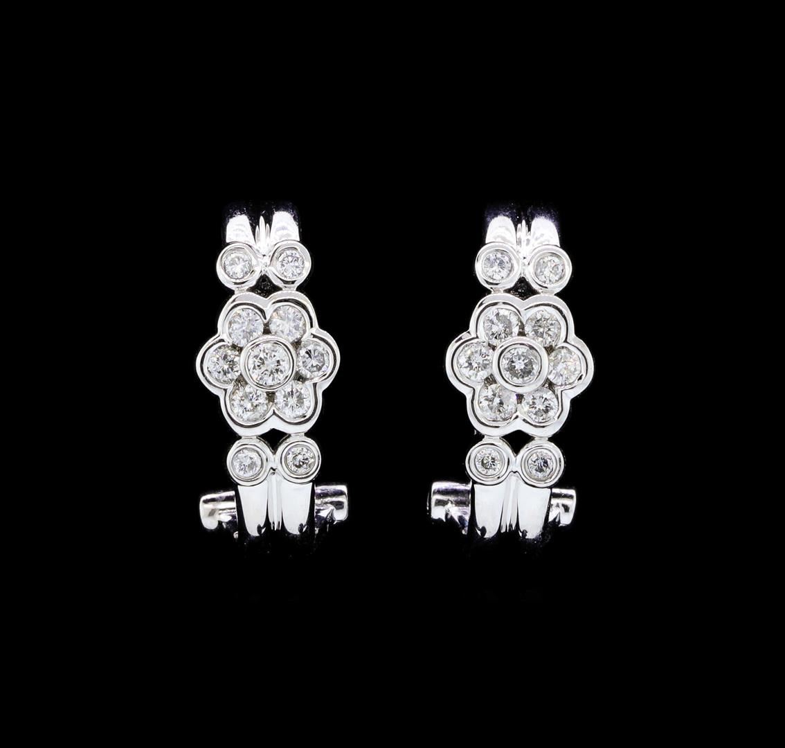 One pair electronically tested 18KT white gold lady's combination cast & assembled fashion earrings with Omega clip backs with posts with a bright polish finish. Identified with markings of "18K 750". Condition is new, good workmanship. Containing: Fourteen bezel set round brilliant cut diamonds, measuring 2.30 - 2.10 x 1.36mm (depth est.) approximate total weight of 14 Stones = 0.46ct. Graded in the setting. Color H - I Clarity SI-2 to I-1 Cut Good Eight bezel set round brilliant cut diamonds, measuring 1.60 - 1.50 x 0.96mm (depth est.) approximate total weight of 8 Stones = 0.12ct. Graded in the setting. Color H - I Clarity SI-1 to I-1 Cut Good. Total Weight of Diamonds 0.58ct. Total Weight of Earrings 5.80gm. GAS Appraised.
