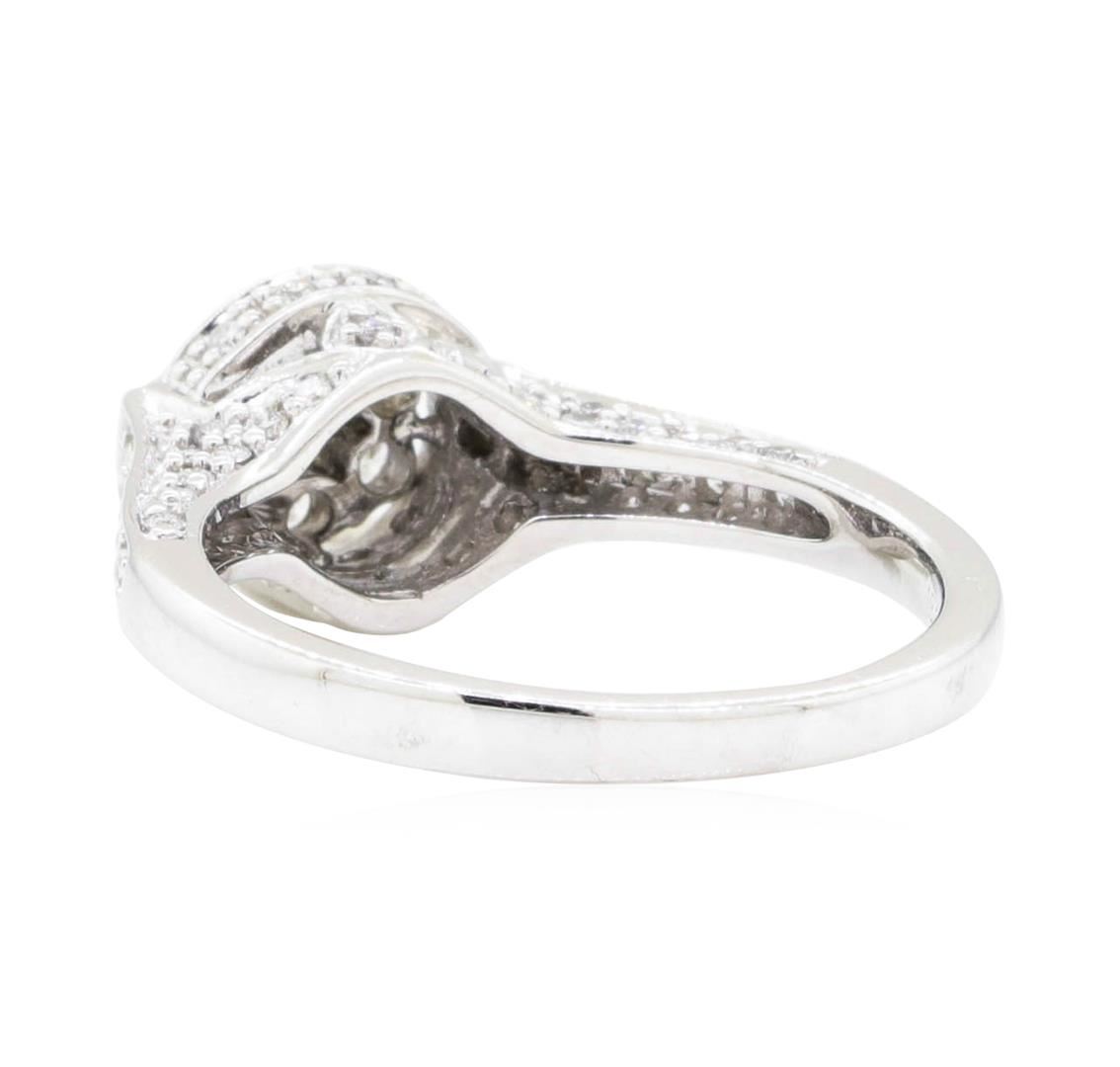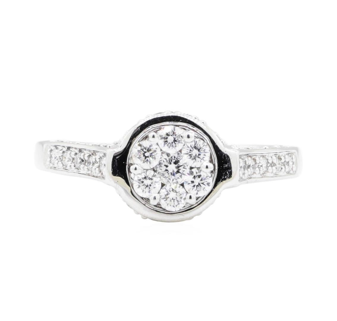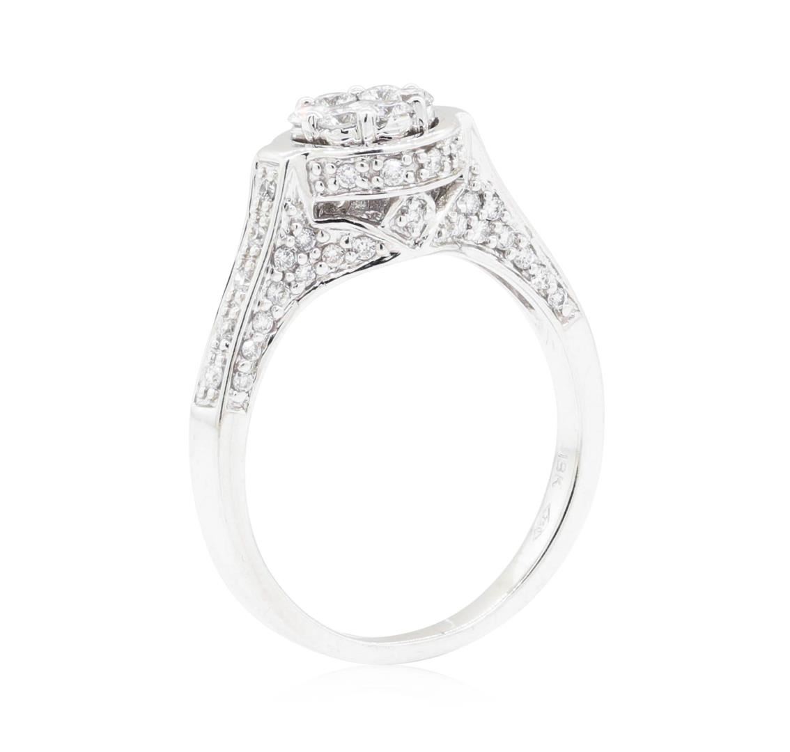 One 18KT white gold Ladies cast fashion wedding ring with a cathedral shank with a bright polish finish. The featured Ladies ring has a shank measuring 1.9 millimeters in width. Identified with markings of '18KT'. Condition is new, good workmanship. Containing: Seven prong set round brilliant cut diamonds, measuring 2.60 - 2.30 x 1.52mm (depth est.) approximate total weight of 7 Stones = 0.40ct. Graded in the setting. Color I - J Clarity VS-2 to SI-1 Cut Very Good Fifty-Six prong set round brilliant cut diamonds, measuring 1.10 - 0.90 x 0.62mm (depth est.) approximate total weight of 56 Stones = 0.22ct. Graded in the setting. Color H - I Clarity SI-1 to SI-2 Cut Very Good. Total Weight of Diamonds 0.62ct.. Total Weight of Wedding Ring 4.60gm. GAS Appraised.