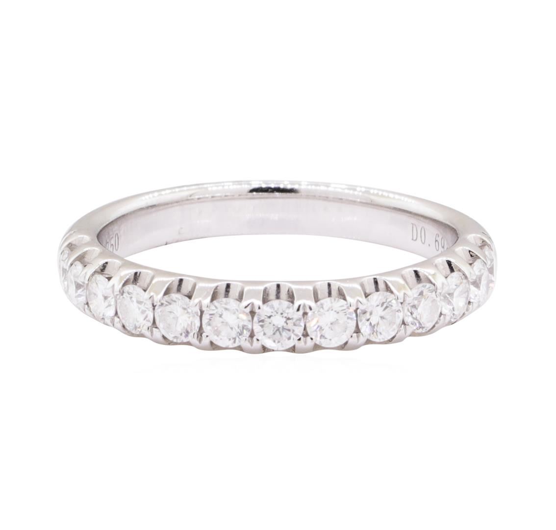 One electronically tested 18KT white gold lady's cast fashion ring with a bright polish finish. The featured lady's ring has a shank measuring 2.70 millimeters wide. Identified with markings of '750'. Condition is new, good workmanship. Containing: Thirteen prong set round brilliant cut diamonds, measuring 2.40 - 2.38 x 1.48mm (depth est.) approximate total weight of 13 Stones = 0.69ct. Graded in the setting. Color G - H, Clarity VS-2 to SI-1, Cut Very Good. Total Weight of Diamonds 0.69ct. Total Weight of Ring 3.90gm. GAS Appraised.