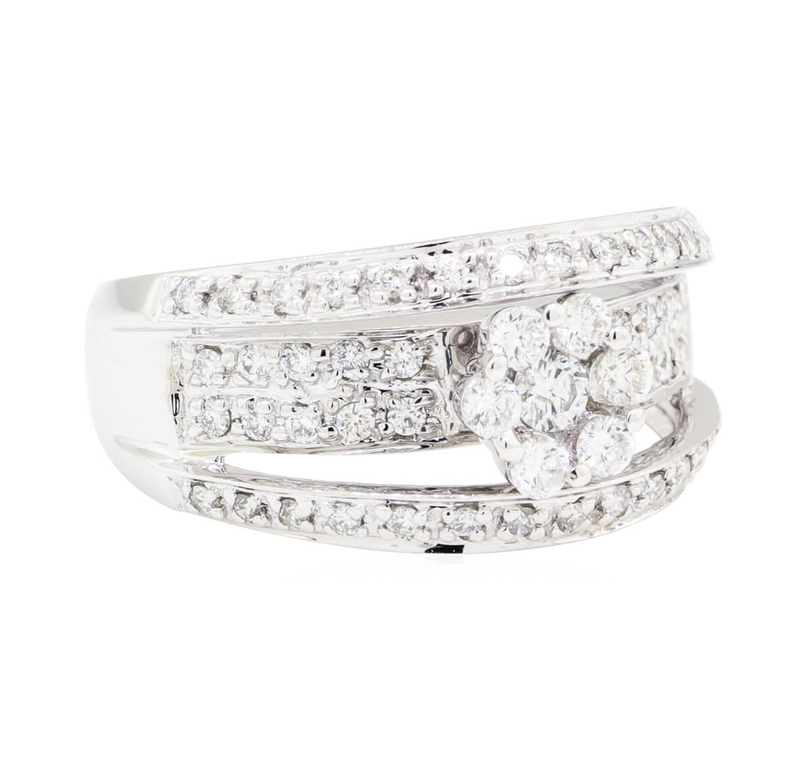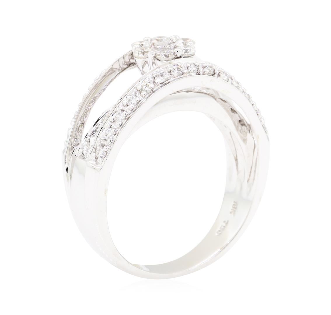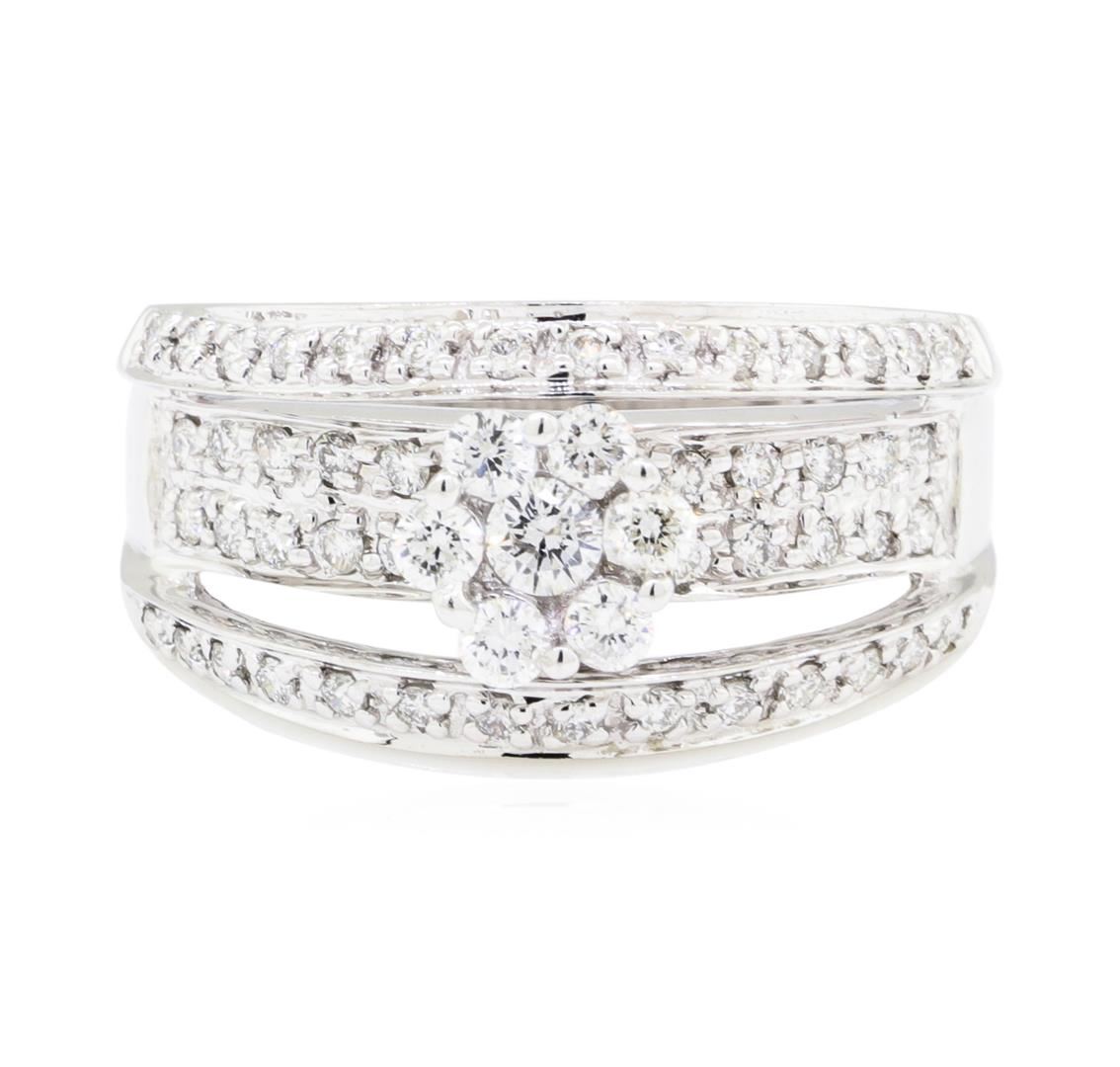 One electronically tested 18KT white gold lady's combination cast & assembled fashion three row wide band with a bright polish finish. The featured lady's ring has a shank measuring 3.50 millimeters wide. Identified with markings of '18K 750'. Condition is new, good workmanship. Containing: One prong set round brilliant cut diamond, measuring 3.00 - 2.95 x 1.85mm (depth est.) approximate weight of 0.10ct. Graded in the setting. Color H Clarity I-1 Cut Very Good Six prong set round brilliant cut diamonds, measuring 2.10 - 2.00 x 1.27mm (depth est.) approximate total weight of 6 Stones = 0.20ct. Graded in the setting. Color H - I Clarity SI-1 to SI-2 Cut Very Good Forty-Eight prong set round brilliant cut diamonds, measuring 1.40 - 1.30 x 0.84mm (depth est.) approximate total weight of 48 Stones = 0.45ct. Graded in the setting. Color H - I Clarity VS-2 to SI-1 Cut Very Good. Total Weight of Diamonds 0.75ct.. Total Weight of Wide Band 7.10gm. GAS Appraised.