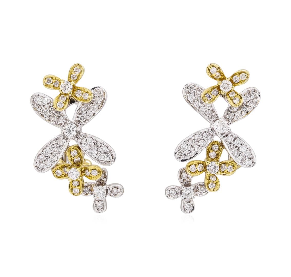One pair electronically tested 18KT white gold lady's combination cast & assembled flower design earrings with Omega clip backs with posts with a bright polish finish. The featured lady's earrings have four graduated floral motifs measuring a total of 25 millimeters in length. Two of the floral motifs have been plated with 18KT yellow gold. Identified with markings of '18K 750'. Condition is new, good workmanship. Containing: Eight prong set round brilliant cut diamonds, measuring 2.00 - 1.90 x 1.21mm (depth est.) approximate total weight of 8 Stones = 0.23ct. Graded in the setting. Color G - H, Clarity SI-1 to I-1, Cut Good One Hundred Four prong set round brilliant cut diamonds, measuring 1.20 - 1.10 x 0.69mm (depth est.) approximate total weight of 104 Stones = 0.57ct. Graded in the setting. Color G - H, Clarity SI-2 to I-1, Cut Good. Total Weight of Diamonds 0.80ct. Total Weight of Earrings 7.30gm. GAS Appraised.