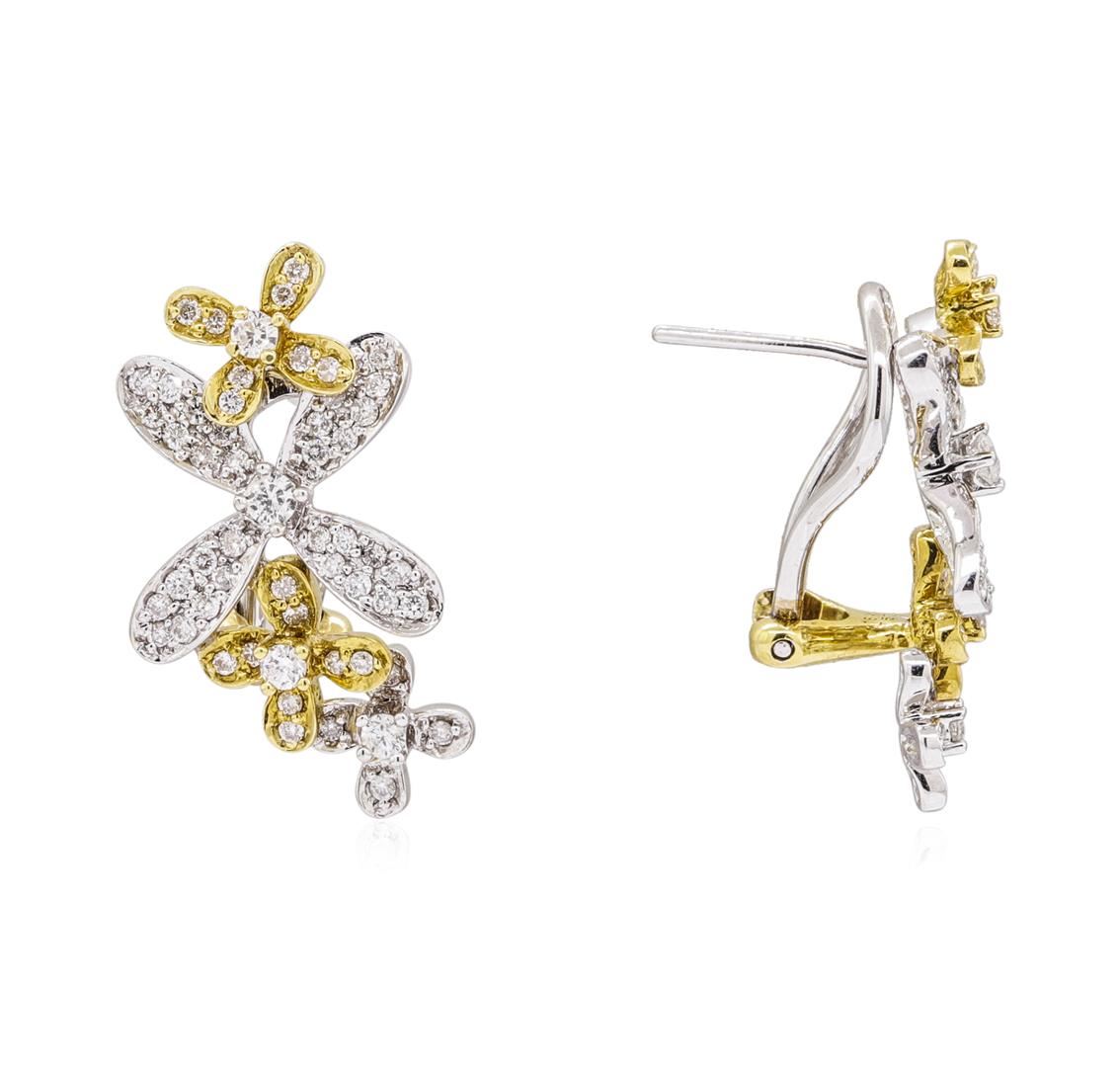 One pair electronically tested 18KT white gold lady's combination cast & assembled flower design earrings with Omega clip backs with posts with a bright polish finish. The featured lady's earrings have four graduated floral motifs measuring a total of 25 millimeters in length. Two of the floral motifs have been plated with 18KT yellow gold. Identified with markings of '18K 750'. Condition is new, good workmanship. Containing: Eight prong set round brilliant cut diamonds, measuring 2.00 - 1.90 x 1.21mm (depth est.) approximate total weight of 8 Stones = 0.23ct. Graded in the setting. Color G - H, Clarity SI-1 to I-1, Cut Good One Hundred Four prong set round brilliant cut diamonds, measuring 1.20 - 1.10 x 0.69mm (depth est.) approximate total weight of 104 Stones = 0.57ct. Graded in the setting. Color G - H, Clarity SI-2 to I-1, Cut Good. Total Weight of Diamonds 0.80ct. Total Weight of Earrings 7.30gm. GAS Appraised.