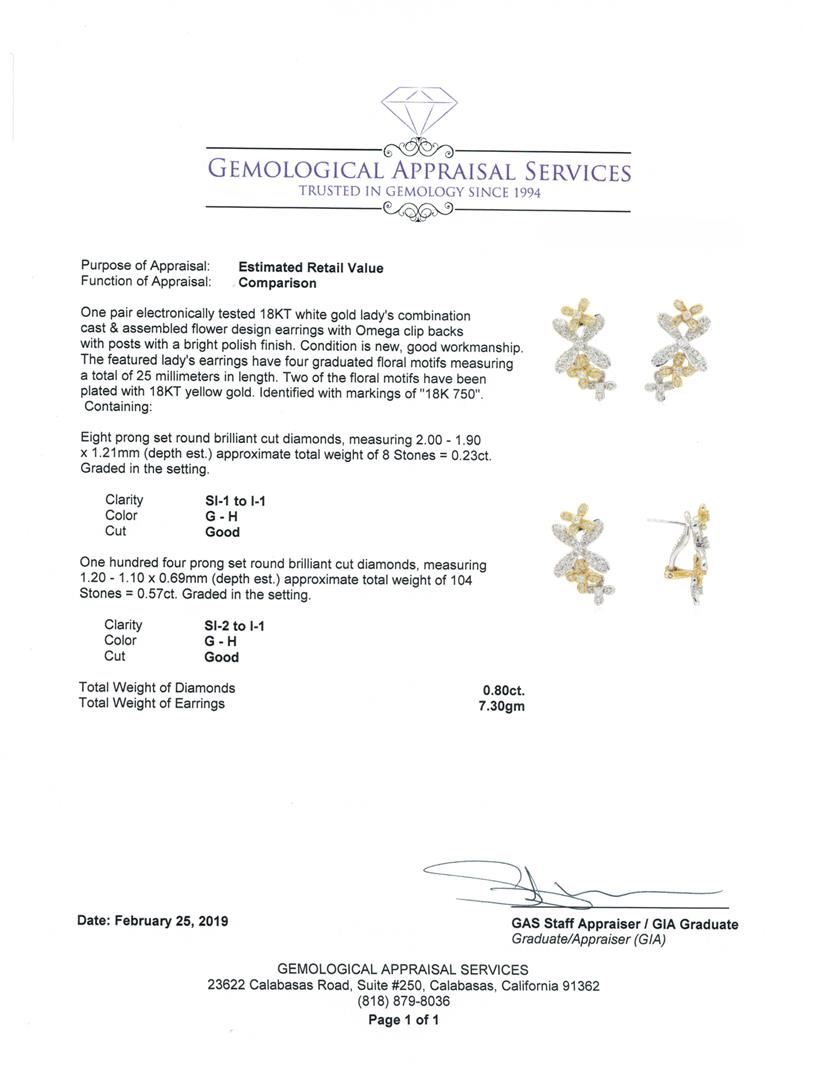 One pair electronically tested 18KT white gold lady's combination cast & assembled flower design earrings with Omega clip backs with posts with a bright polish finish. The featured lady's earrings have four graduated floral motifs measuring a total of 25 millimeters in length. Two of the floral motifs have been plated with 18KT yellow gold. Identified with markings of '18K 750'. Condition is new, good workmanship. Containing: Eight prong set round brilliant cut diamonds, measuring 2.00 - 1.90 x 1.21mm (depth est.) approximate total weight of 8 Stones = 0.23ct. Graded in the setting. Color G - H, Clarity SI-1 to I-1, Cut Good One Hundred Four prong set round brilliant cut diamonds, measuring 1.20 - 1.10 x 0.69mm (depth est.) approximate total weight of 104 Stones = 0.57ct. Graded in the setting. Color G - H, Clarity SI-2 to I-1, Cut Good. Total Weight of Diamonds 0.80ct. Total Weight of Earrings 7.30gm. GAS Appraised.