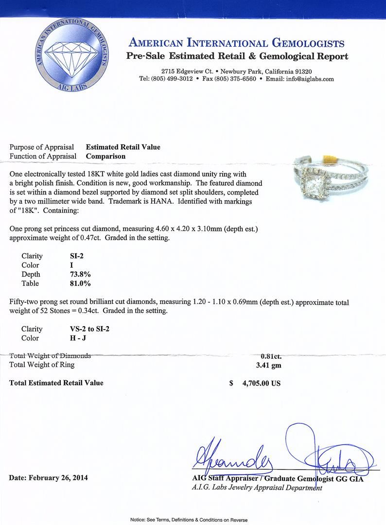 One electronically tested 18KT white gold ladies cast diamond unity ring with a bright polish finish. The featured diamond is set within a diamond bezel supported by diamond set split shoulders, completed by a two millimeter wide band. Trademark is HANA. Identified with markings of "18K". Condition is new, good workmanship. Containing: One prong set princess cut diamond, measuring 4.60 x 4.20 x 3.10mm (depth est.) approximate weight of 0.47ct. Graded in the setting. Clarity: SI-2. Color: IDepth 73.8%. Table 81.0%. Fifty-Two prong set round brilliant cut diamonds, measuring 1.20 - 1.10 x 0.69mm (depth est.) approximate. Total Weight of 52 Stones = 0.34ct. Graded in the setting. Clarity: VS-2 to SI-2. Color: H - J. Total Weight of Diamonds 0.81ct. AIG Appraised at $4,705.00.
