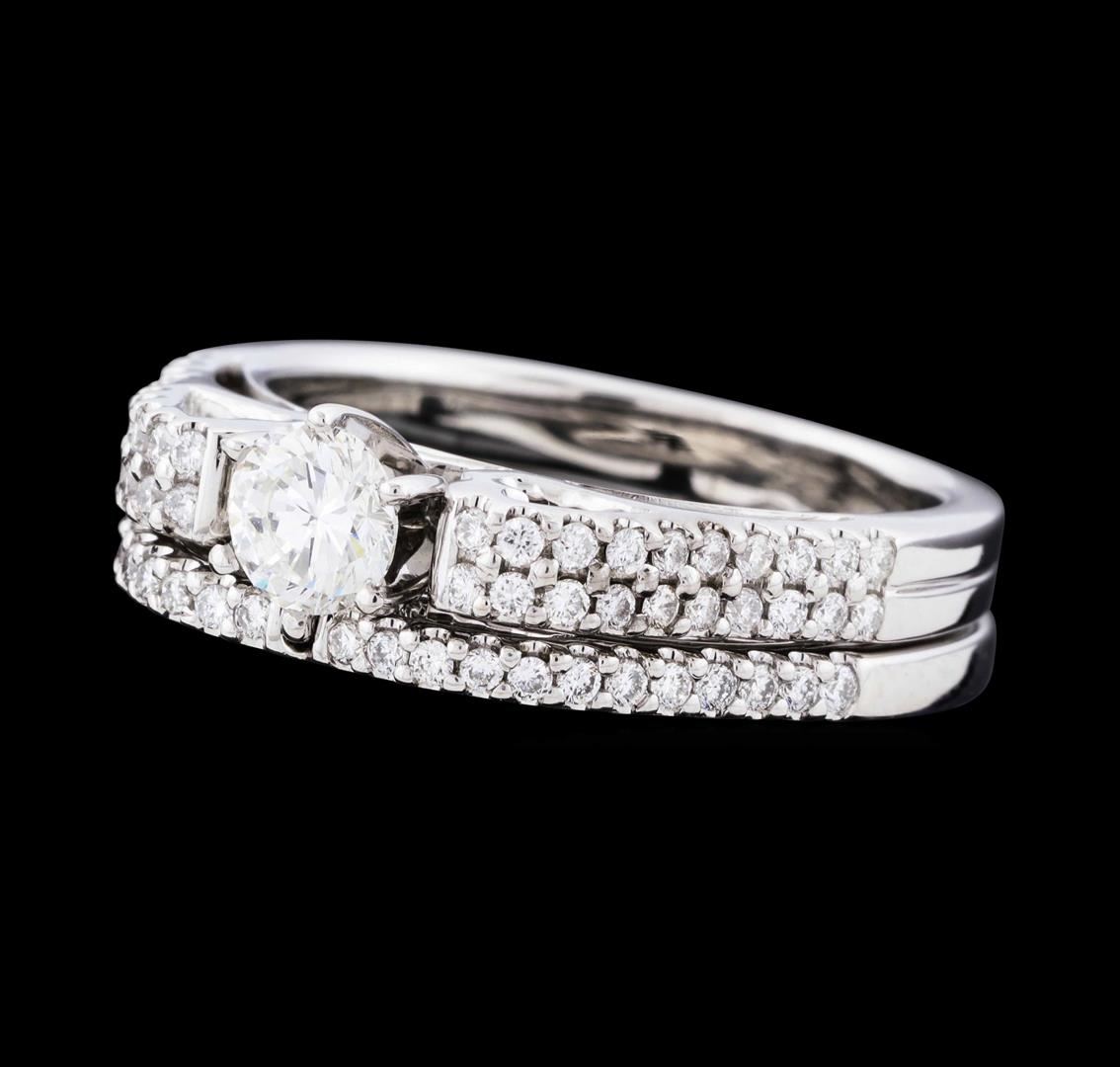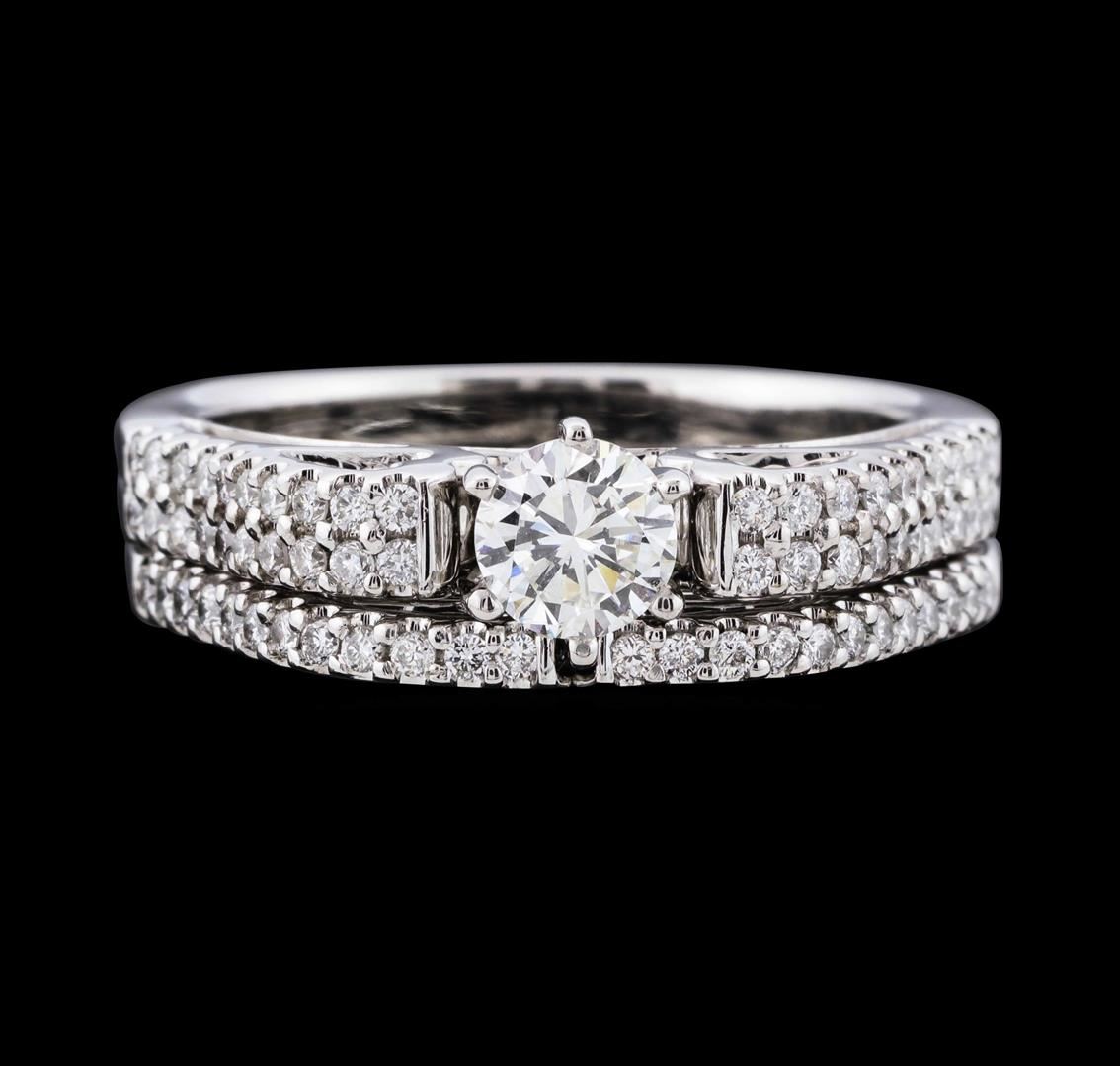 One electronically tested 18KT white gold lady's combination cast & assembled wedding ring soldered to wedding band with a cathedral shank with a bright polish finish. The featured lady's wedding ring and wedding band have a double shank measuring 4.83 millimeters wide. Identified with markings of "18K". Condition is new, good workmanship. Containing: One prong set round brilliant cut diamond, measuring 5.00 - 4.96 x 3.09mm (depth est.) approximate weight of 0.45ct. Graded in the setting. Clarity: SI-1. Color: HCut Good Sixty-Four prong set round brilliant cut diamonds, measuring 1.30 - 1.20 x 0.75mm (depth est.) approximate total weight of 64 Stones = 0.45ct. Graded in the setting. Clarity: SI-1 to SI-2. Color: H - ICut Good. Total Weight of Diamonds 0.90ct. Total Weight of Ring Soldered To Wedding Band 8.90gm. GAS Appraised.