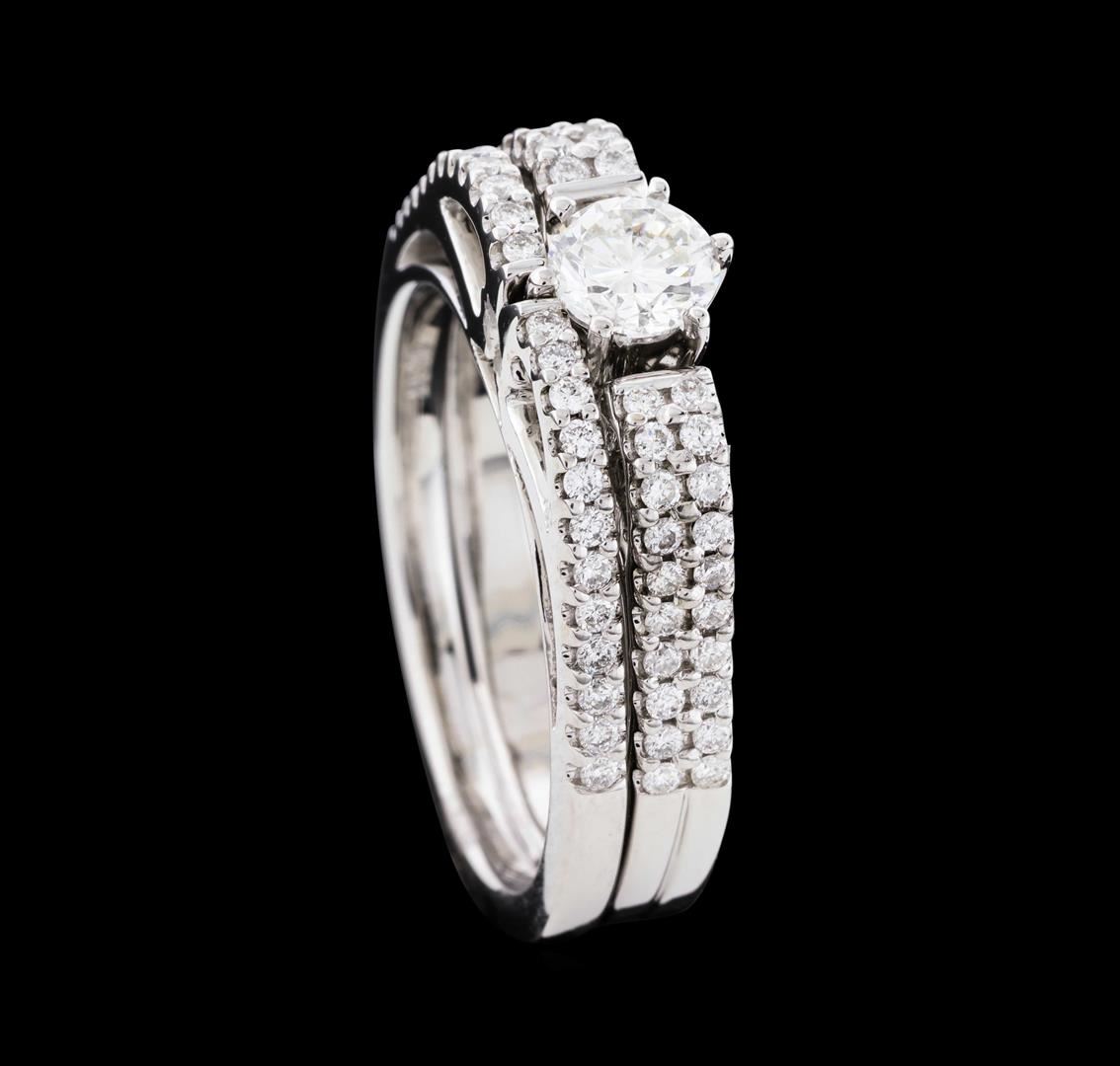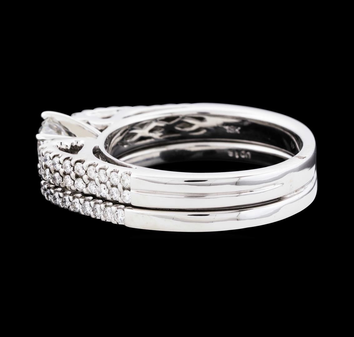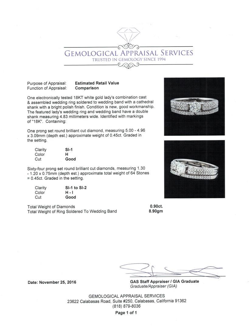 One electronically tested 18KT white gold lady's combination cast & assembled wedding ring soldered to wedding band with a cathedral shank with a bright polish finish. The featured lady's wedding ring and wedding band have a double shank measuring 4.83 millimeters wide. Identified with markings of "18K". Condition is new, good workmanship. Containing: One prong set round brilliant cut diamond, measuring 5.00 - 4.96 x 3.09mm (depth est.) approximate weight of 0.45ct. Graded in the setting. Clarity: SI-1. Color: HCut Good Sixty-Four prong set round brilliant cut diamonds, measuring 1.30 - 1.20 x 0.75mm (depth est.) approximate total weight of 64 Stones = 0.45ct. Graded in the setting. Clarity: SI-1 to SI-2. Color: H - ICut Good. Total Weight of Diamonds 0.90ct. Total Weight of Ring Soldered To Wedding Band 8.90gm. GAS Appraised.