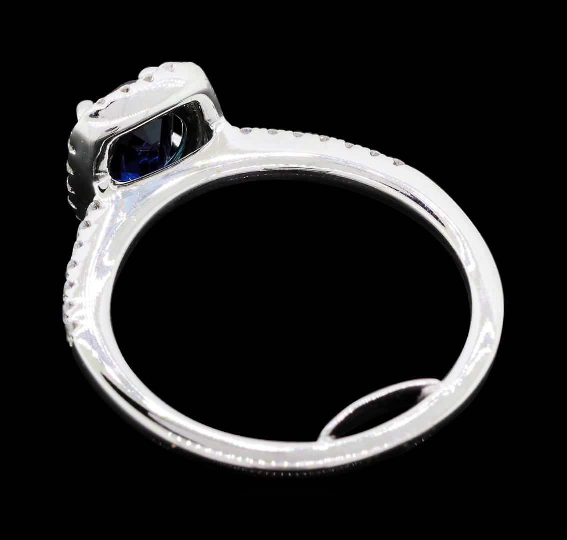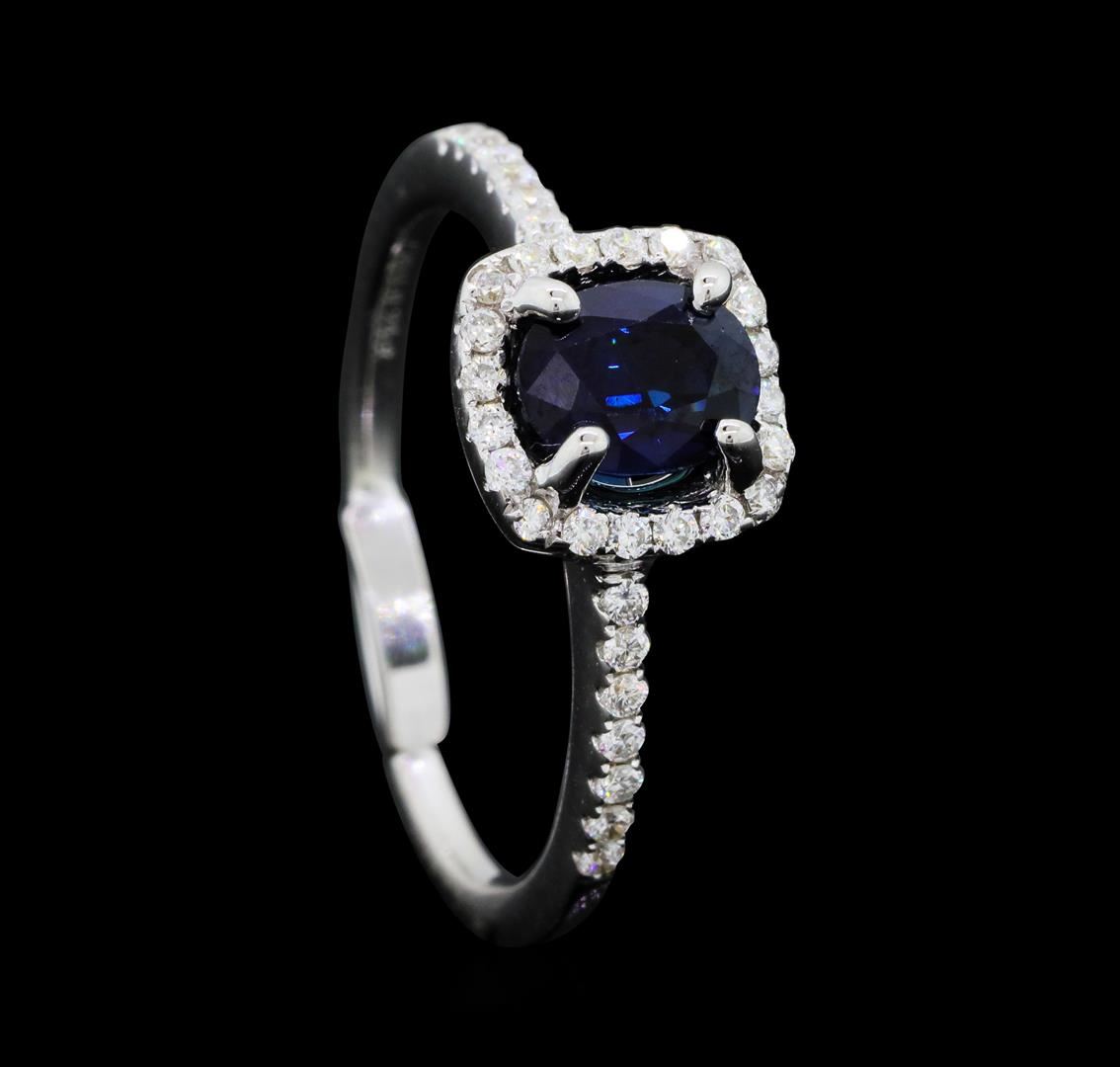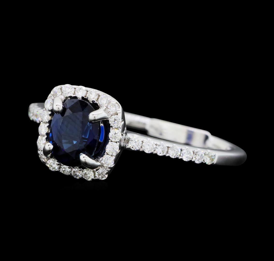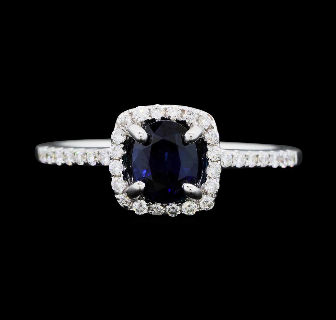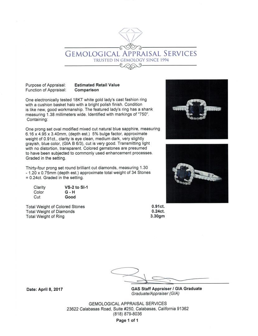 One electronically tested 18KT white gold lady's cast fashion ring with a cushion basket halo with a bright polish finish. The featured lady's ring has a shank measuring 1.38 millimeters wide. Identified with markings of "750". Condition is like new, good workmanship. Containing: One prong set oval modified mixed cut natural blue sapphire, measuring 6.16 x 4.95 x 3.40mm, (depth est.) 5%. bulge factor, approximate weight of 0.91ct., clarity is eye clean, medium dark, very slightly grayish, blue color, (GIA B 6/3), cut is very good. Transmitting light with no distortion, transparent. Colored gemstones are presumed to have been subjected to commonly used enhancement processes. Graded in the setting. Thirty-Four prong set round brilliant cut diamonds, measuring 1.30 - 1.20 x 0.75mm (depth est.) approximate total weight of 34 Stones = 0.24ct. Graded in the setting. Color G - H, Clarity VS-2 to SI-1 Cut Good. Total Weight of Colored Stones 0.91ct. Total Weight of Diamonds 0.24ct. Total Weight of Ring 3.30gm. GAS Appraised.