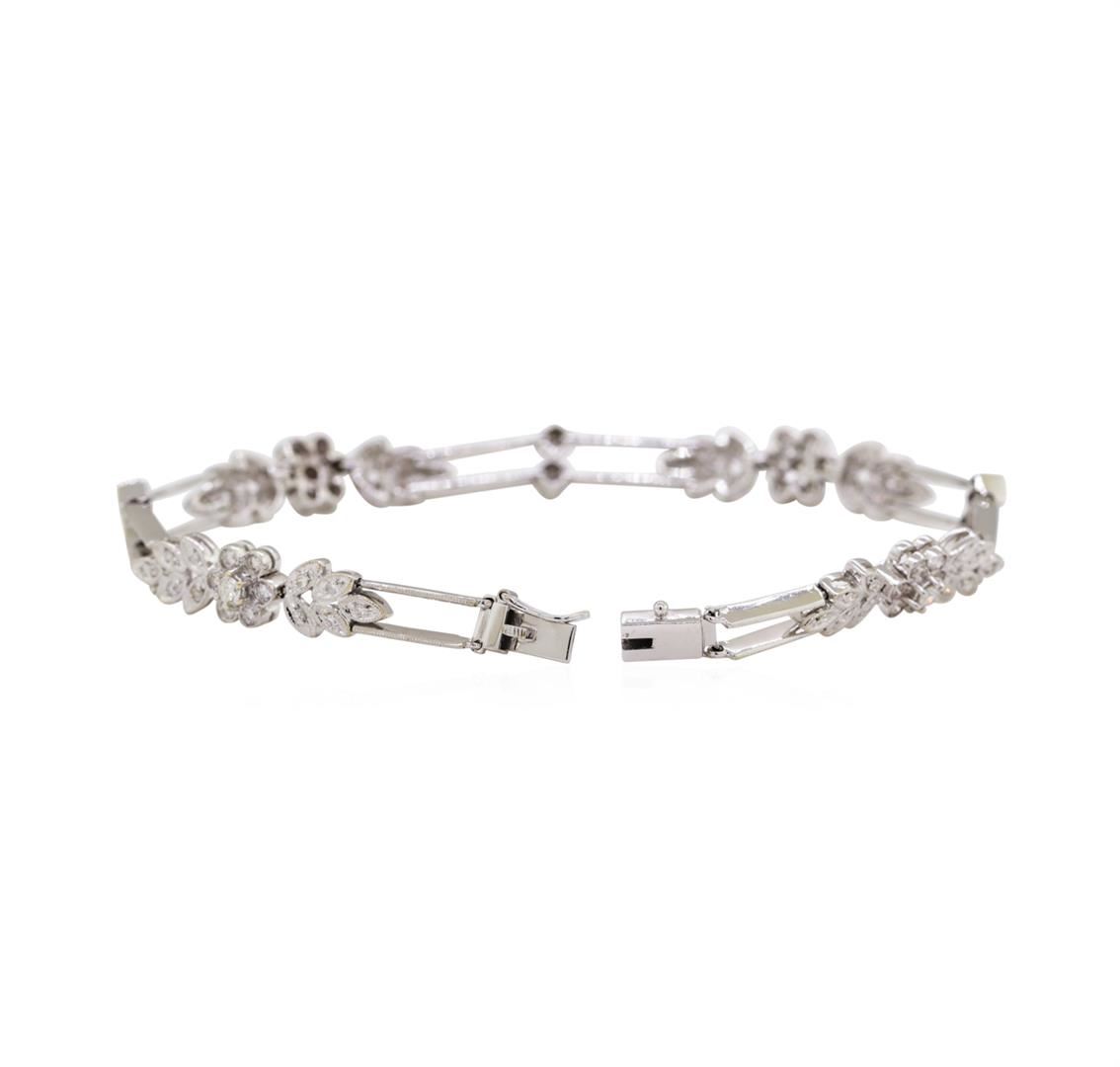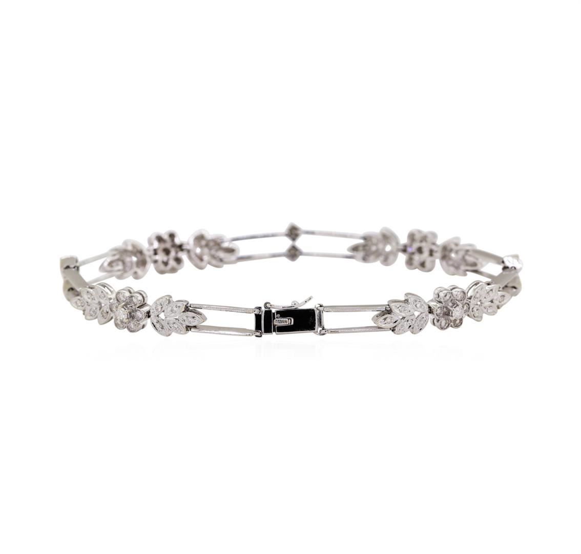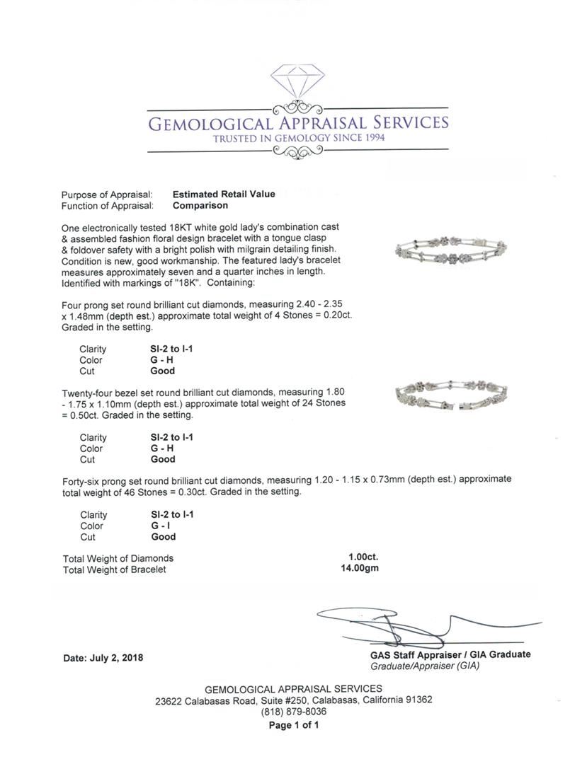 One electronically tested 18KT white gold lady's combination cast & assembled fashion floral design bracelet with a tongue clasp & foldover safety with a bright polish with milgrain detailing finish. The featured lady's bracelet measures approximately seven and a quarter inches in length. Identified with markings of '18K'. Condition is new, good workmanship. Containing: Four prong set round brilliant cut diamonds, measuring 2.40 - 2.35 x 1.48mm (depth est.) approximate total weight of 4 Stones = 0.20ct. Graded in the setting. Color G - H Clarity SI-2 to I-1 Cut Good Twenty-Four bezel set round brilliant cut diamonds, measuring 1.80 - 1.75 x 1.10mm (depth est.) approximate total weight of 24 Stones = 0.50ct. Graded in the setting. Color G - H Clarity SI-2 to I-1 Cut Good Forty-Six prong set round brilliant cut diamonds, measuring 1.20 - 1.15 x 0.73mm (depth est.) approximate total weight of 46 Stones = 0.30ct. Graded in the setting. Color G - I Clarity SI-2 to I-1 Cut Good. Total Weight of Diamonds 1.00ct. Total Weight of Bracelet 14.00gm. GAS Appraised.