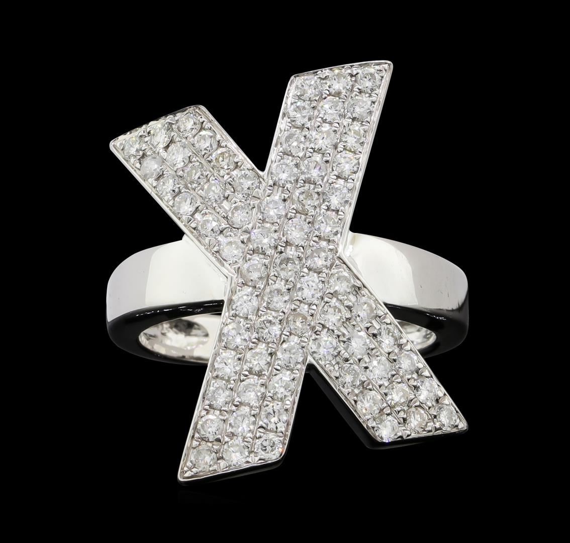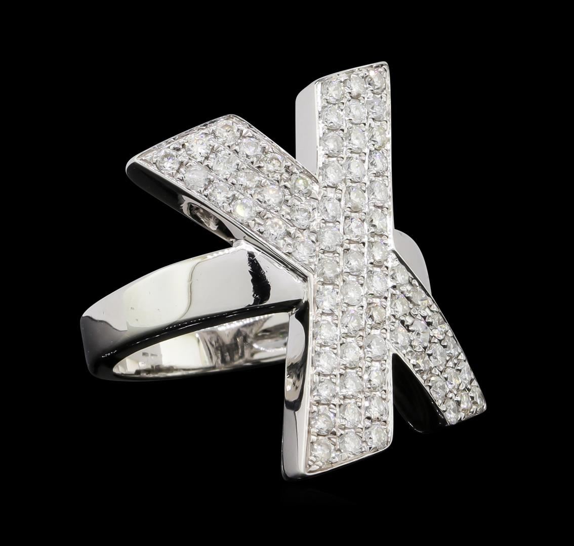 One electronically tested 18KT white gold lady's cast fashion "x" motif ring with a bright polish finish. The featured lady's ring has a shank measuring 2.75 millimeters wide. Identified with markings of "750". Condition is new, good workmanship. Containing: Sixty-Nine prong set round brilliant cut diamonds, measuring 1.60 - 1.50 x 0.96mm (depth est.) approximate total weight of 69 Stones = 1.00ct. Graded in the setting. Clarity: SI-1 to I-1. Color: G - HCut Good. Total Weight of Diamonds 1.00ct. Total Weight of Ring 6.50gm. GAS Appraised.