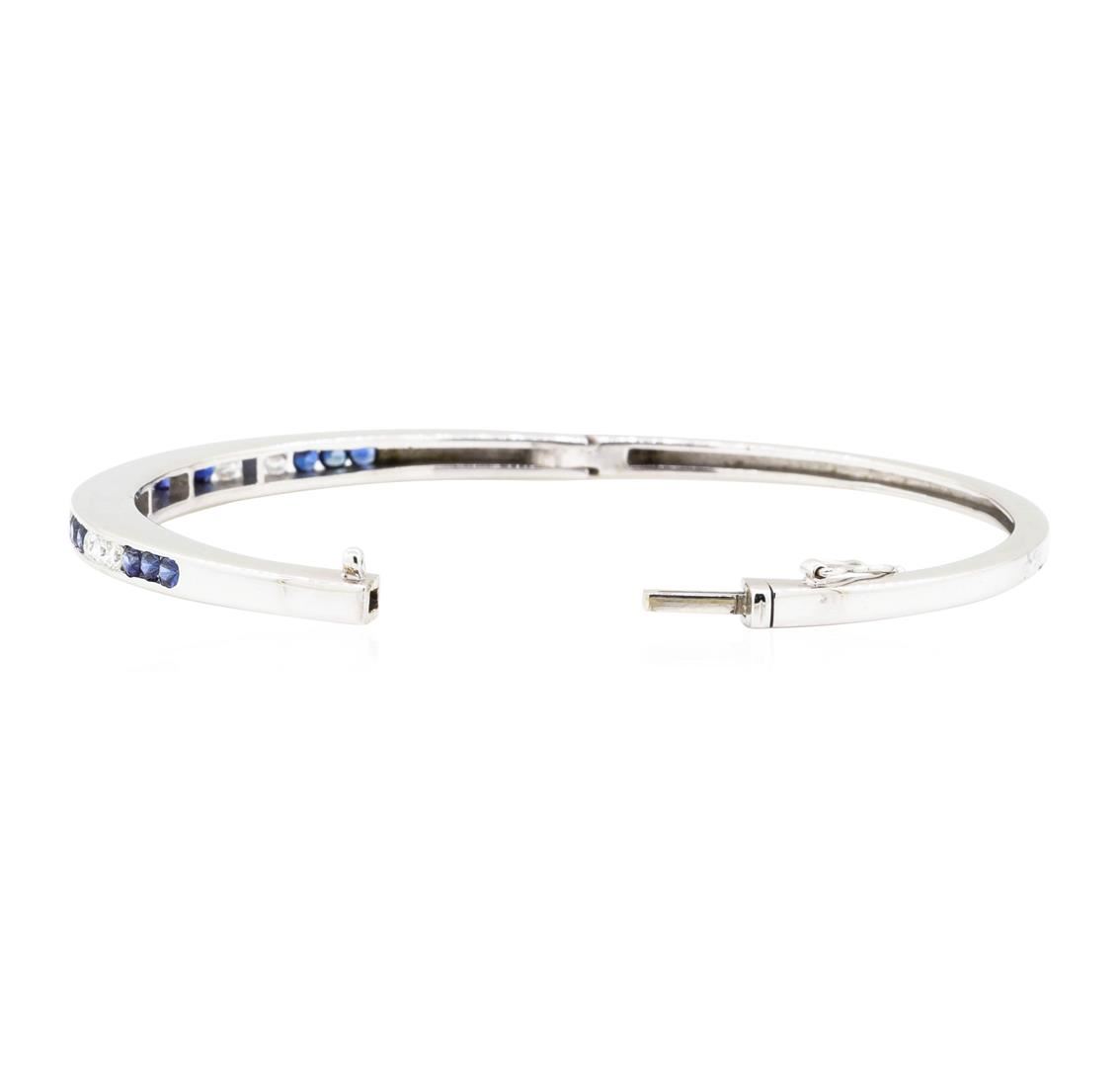 One electronically tested 18KT white gold Ladies combination cast & assembled fashion bangle bracelet with a tongue clasp with foldover safety with a bright polish finish. The featured Ladies bracelet has a circumference measuring approximately six and a half inches. Identified with markings of '18K'. Condition is new, good workmanship. Containing: Fifteen channel set round modified brilliant cut natural blue sapphires, measuring 2.30 - 2.20 x 1.46 mm, (depth est.) approximate total weight of 1.00ct., clarity is eye clean, medium, very slightly grayish, blue color, (GIA B 5/3), cut is very good. Transmitting light with no distortion, transparent. Colored gemstones are presumed to have been subjected to commonly used enhancement processes. Graded in the setting. Twelve channel set round brilliant cut diamonds, measuring 2.40 - 2.30 x 1.46mm (depth est.) approximate total weight of 12 Stones = 0.60ct. Graded in the setting. Color H - I Clarity VS-2 to SI-1 Cut Very Good. Total Weight of Colored Stones 1.00ct.. Total Weight of Diamonds 0.60ct.. Total Weight of Bangle Bracelet 18.20gm. GAS Appraised.