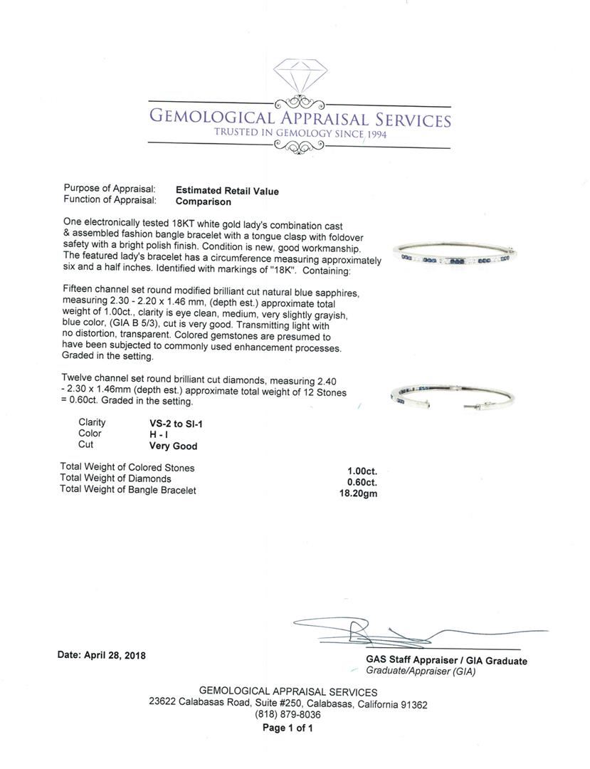 One electronically tested 18KT white gold Ladies combination cast & assembled fashion bangle bracelet with a tongue clasp with foldover safety with a bright polish finish. The featured Ladies bracelet has a circumference measuring approximately six and a half inches. Identified with markings of '18K'. Condition is new, good workmanship. Containing: Fifteen channel set round modified brilliant cut natural blue sapphires, measuring 2.30 - 2.20 x 1.46 mm, (depth est.) approximate total weight of 1.00ct., clarity is eye clean, medium, very slightly grayish, blue color, (GIA B 5/3), cut is very good. Transmitting light with no distortion, transparent. Colored gemstones are presumed to have been subjected to commonly used enhancement processes. Graded in the setting. Twelve channel set round brilliant cut diamonds, measuring 2.40 - 2.30 x 1.46mm (depth est.) approximate total weight of 12 Stones = 0.60ct. Graded in the setting. Color H - I Clarity VS-2 to SI-1 Cut Very Good. Total Weight of Colored Stones 1.00ct.. Total Weight of Diamonds 0.60ct.. Total Weight of Bangle Bracelet 18.20gm. GAS Appraised.