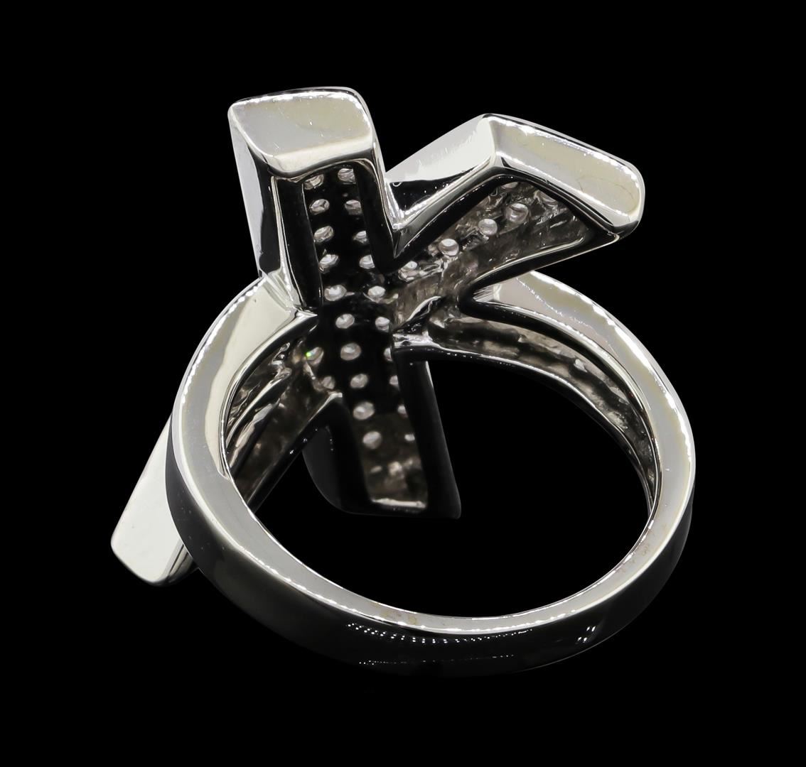 One electronically tested 18KT white gold lady's cast fashion "x" motif ring with a bright polish finish. The featured lady's ring has a shank measuring 2.75 millimeters wide. Identified with markings of "750". Condition is new, good workmanship. Containing: Sixty-Nine prong set round brilliant cut diamonds, measuring 1.60 - 1.50 x 0.96mm (depth est.) approximate total weight of 69 Stones = 1.00ct. Graded in the setting. Clarity: SI-1 to I-1. Color: G - HCut Good. Total Weight of Diamonds 1.00ct. Total Weight of Ring 6.50gm. GAS Appraised.