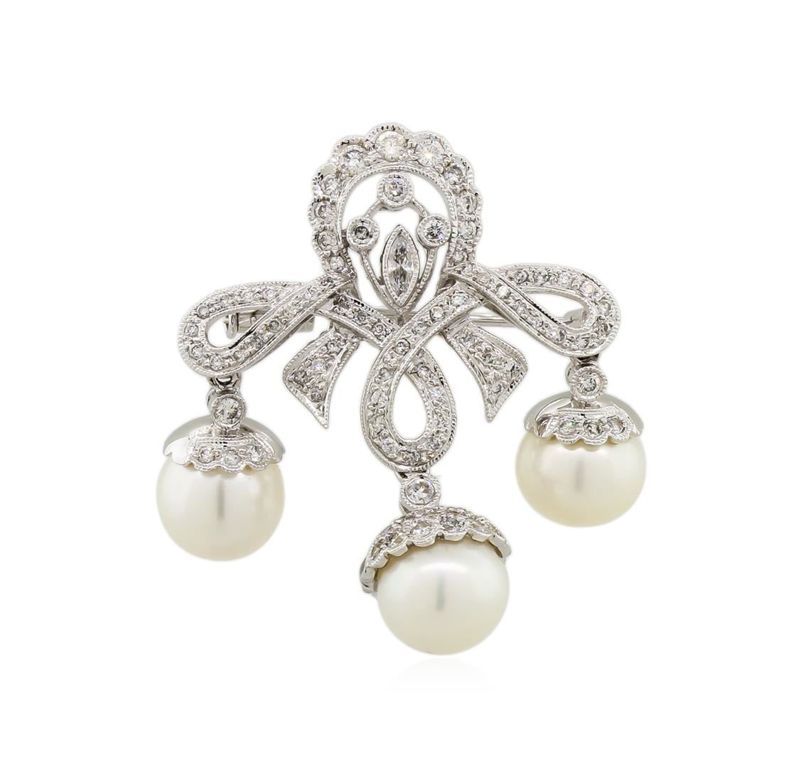 Add a touch of sophistication to your clothes, handbag or hair with this luxurious diamond and pearl brooch pin. This elegant design features three 9mm pearls, 0.91 carats of round diamonds and a 0.10 carat marquise cut diamond.