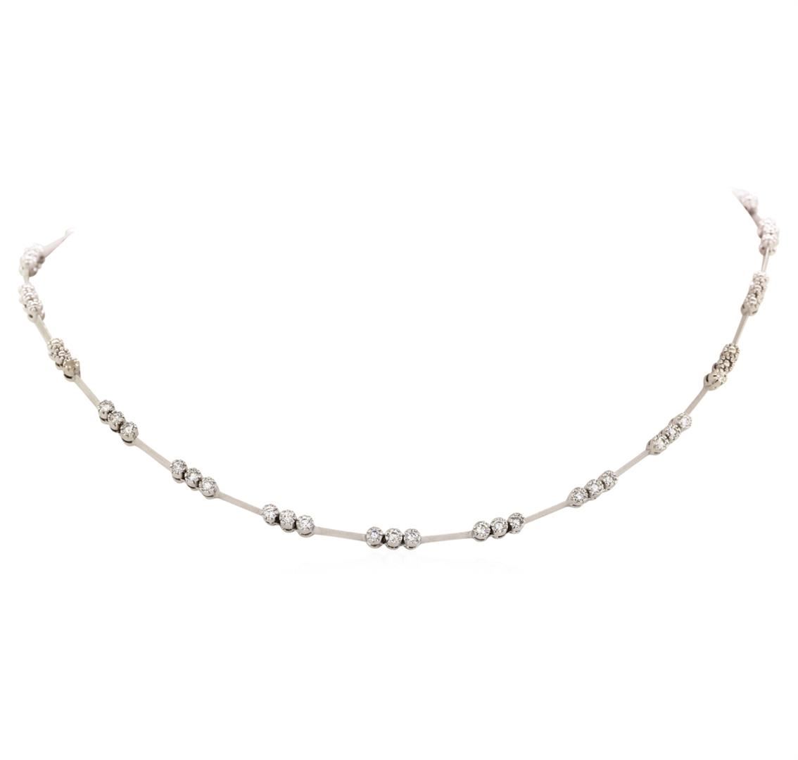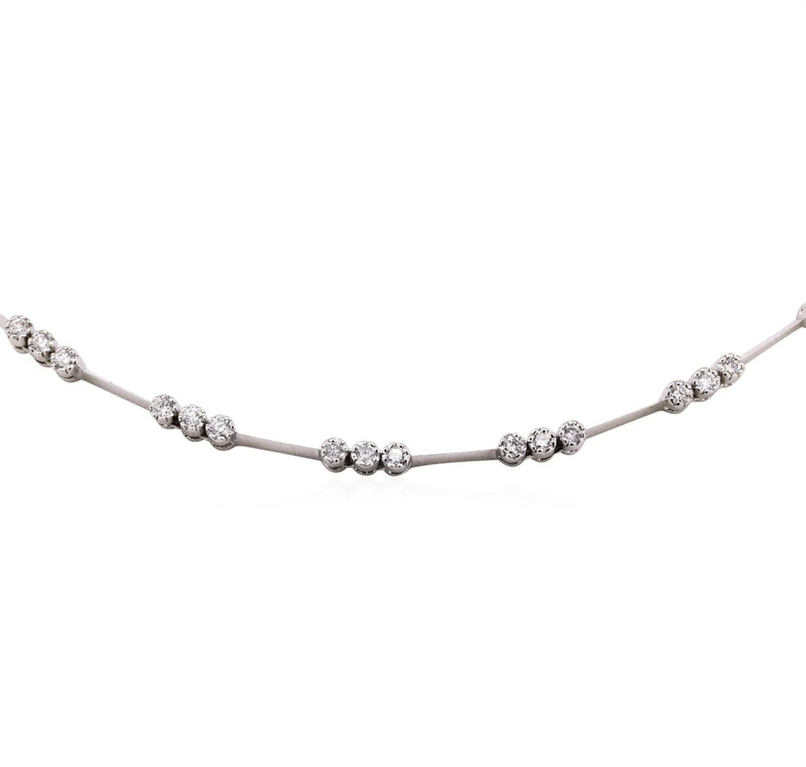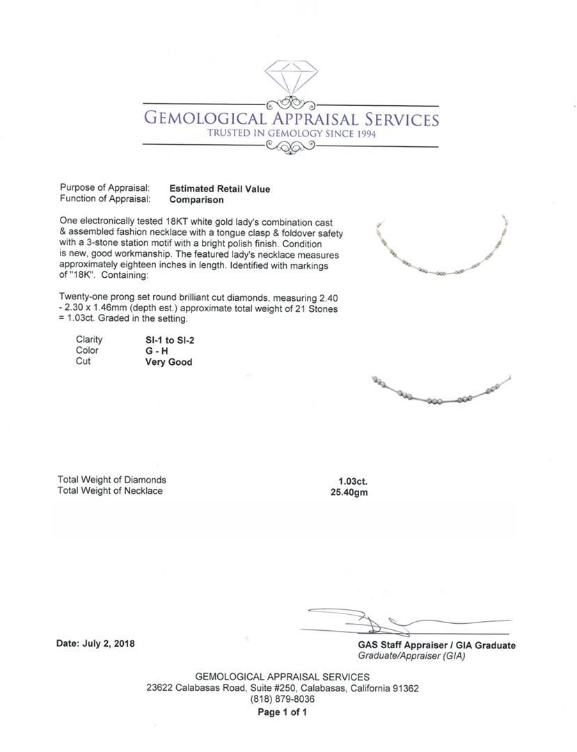 One electronically tested 18KT white gold lady's combination cast & assembled fashion necklace with a tongue clasp & foldover safety with a 3-stone station motif with a bright polish finish. The featured lady's necklace measures approximately eighteen inches in length. Identified with markings of '18K'. Condition is new, good workmanship. Containing: Twenty-One prong set round brilliant cut diamonds, measuring 2.40 - 2.30 x 1.46mm (depth est.) approximate total weight of 21 Stones = 1.03ct. Graded in the setting. Color G - H Clarity SI-1 to SI-2 Cut Very Good. Total Weight of Diamonds 1.03ct. Total Weight of Necklace 25.40gm. GAS Appraised.