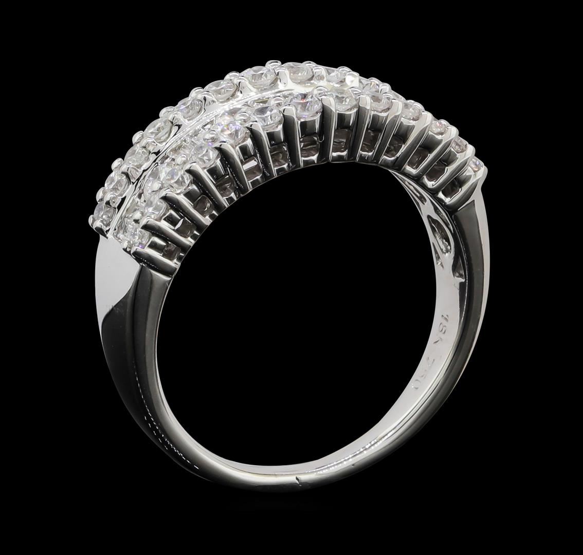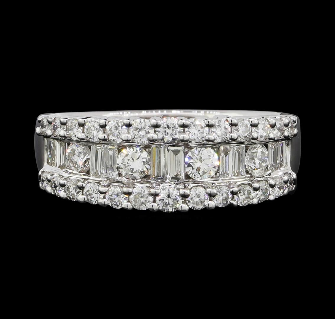 One electronically tested 18KT white gold lady's combination cast & assembled fashion ring with a tapered shank with a bright polish finish. The featured lady's ring has a shank measuring 1.79 millimeters wide. Identified with markings of "18K 750". Condition is new, good workmanship. Containing: Four channel set round brilliant cut diamonds, measuring 2.60 - 2.50 x 1.58mm (depth est.) approximate total weight of 4 Stones = 0.25ct. Graded in the setting. Clarity: VS-2 to SI-1. Color: G - HCut Very Good Ten channel set baguette cut diamonds, measuring from 2.40 x 1.20 x 1.02mm (depth est.) to 2.75 x 1.40 x 1.19mm (depth est.) approximate total weight of 10 Stones = 0.34ct. Graded in the setting. Clarity: VS-1 to VS-2. Color: G - HCut Very Good Twenty-Six prong set round brilliant cut diamonds, measuring 1.95 - 1.50 x 1.04mm (depth est.) approximate total weight of 26 Stones = 0.45ct. Graded in the setting. Clarity: VS-2 to SI-2. Color: G - HCut Good. Total Weight of Diamonds 1.04ct. Total Weight of Ring 5.30gm. GAS Appraised at $4,115.00.