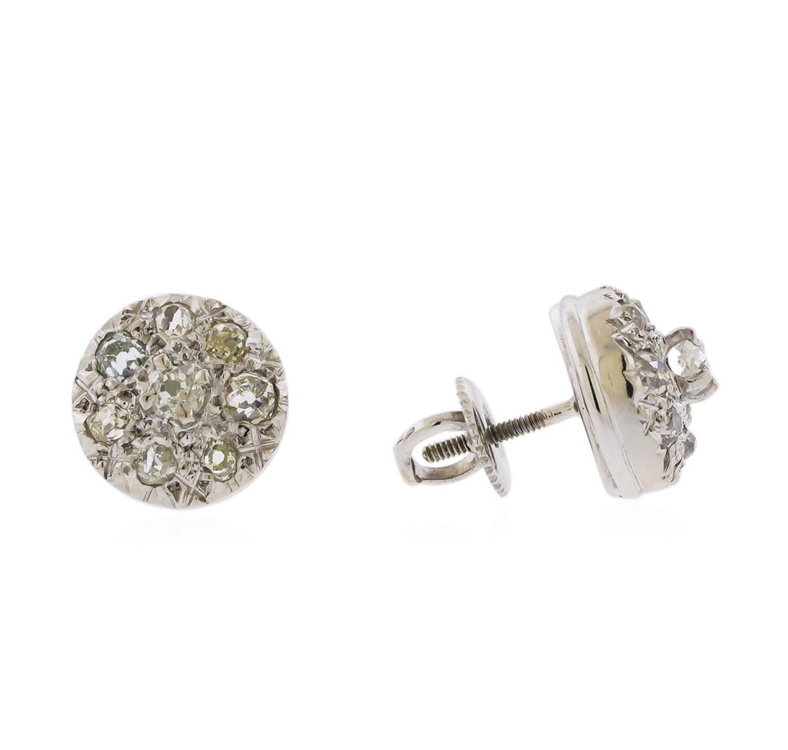 One pair electronically tested 18KT white gold ladies cast & assembled diamond earrings with screw backs. Each earring features an Old European cut diamond set within a vintage style diamond bezel. Bright and patterned finish. Condition is new, good workmanship. Containing: Six prong set Old European cut diamonds, measuring 3.20 - 2.80 x 1.94mm (depth est.) approximate total weight of 6 Stones = 0.64ct. Cutting style circa early 19th century. Graded in the setting. Clarity: SI-1 to SI-2. Color: F - H Ten prong set Old European cut diamonds, measuring 2.30 - 2.00 x 1.33mm (depth est.) approximate total weight of 10 Stones = 0.40ct. Clarity grade is an average for the group. Cutting style circa early 19th century. Graded in the setting. Clarity: SI-1 to SI-2. Color: H - J. Total Weight of Diamonds 1.04ct. Total Weight of Earrings 4.79gm. AIG Appraised at $3,565.00.