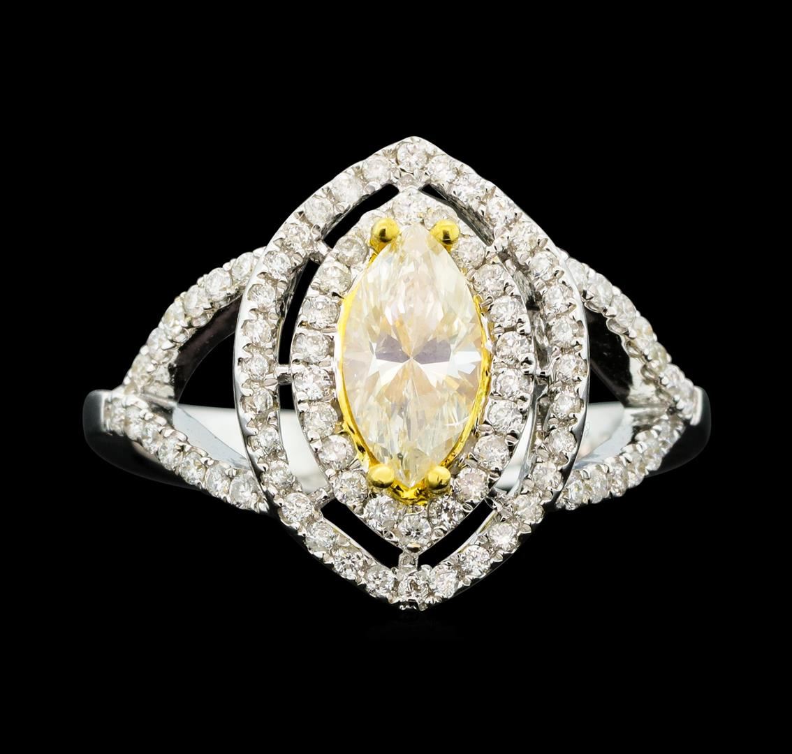 One electronically tested 18KT white gold ladies cast diamond ring. The featured diamond is mounted in an 18KT yellow gold accented basket set within a tiered diamond bezel supported by diamond set split shoulders, completed by a two and one half millimeter wide band. Bright polish finish with 18KT yellow gold accents. Trademark is HANA. Identified with markings of "18K". Condition is new, good workmanship. Containing: One prong set marquise shaped cut diamond, measuring 8.50 x 4.50 x 3.00mm (depth est.) approximate weight of 0.67ct. Graded in the setting. Clarity: SI-1. Color: JDepth 66.7%. Table 53.3%. Eighty prong set round brilliant cut diamonds, measuring 1.00 - 1.00 x 0.60mm (depth est.) approximate total weight of 80 Stones = 0.39ct. Graded in the setting. Clarity: I-1 to I-2. Color: F - H. Total Weight of Diamonds 1.06ct. Total Weight of Ring 4.30gm. AIG Appraised.