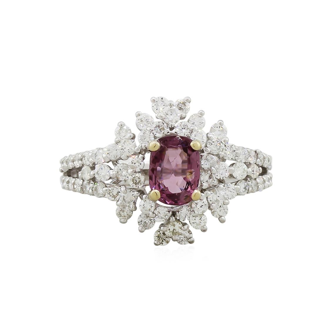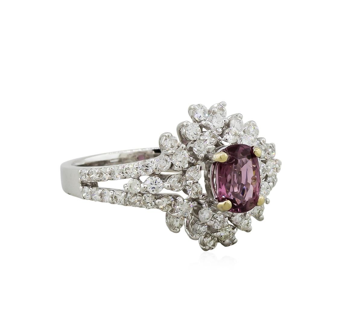 Elegant and feminine, this spinel and diamond ring is set in 4.05 grams of 18KT white gold and boasts a beautiful 0.95 carat spinel center-stone surrounded by sixty-four round diamonds totally 1.06 carats.