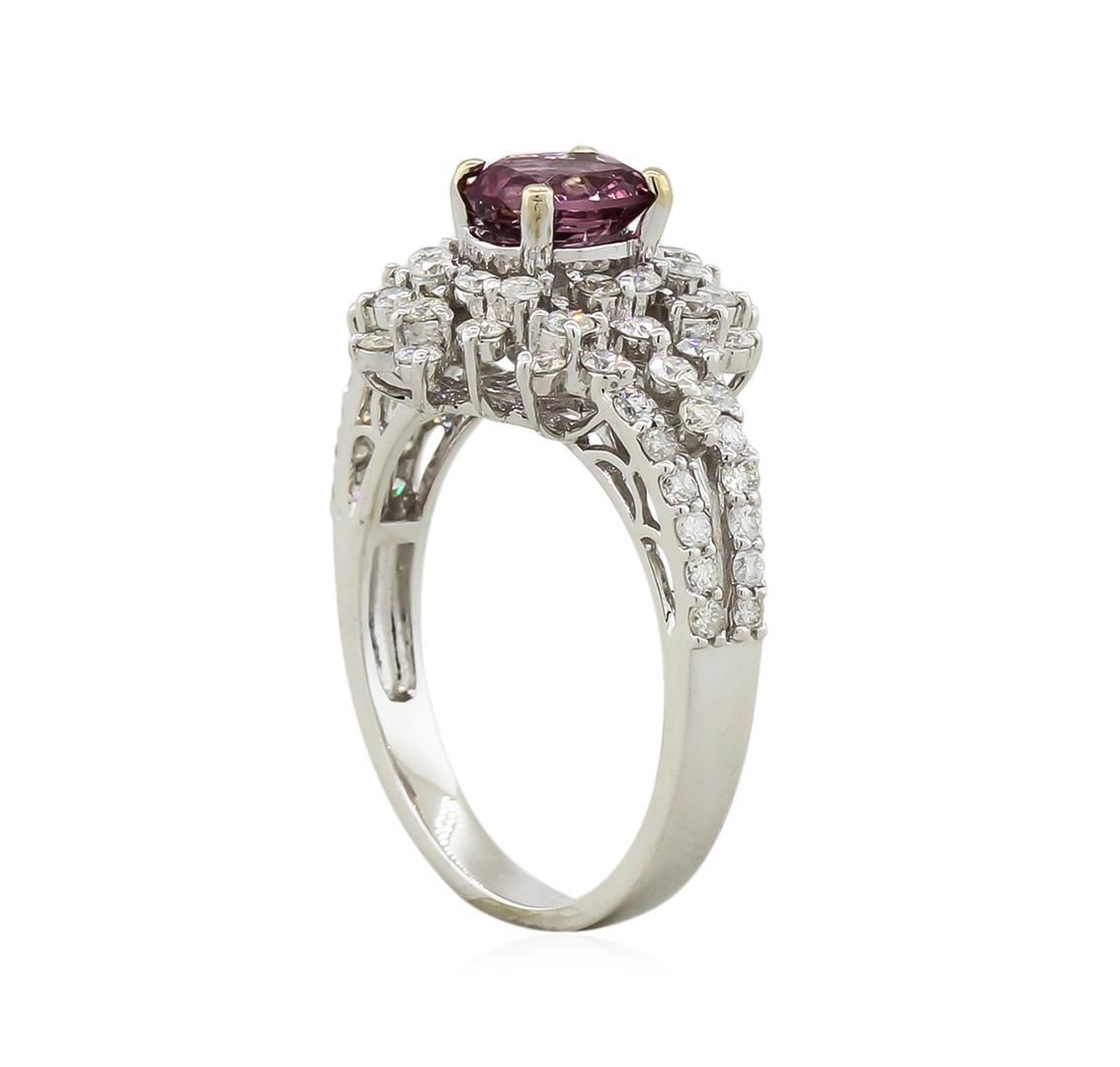 Elegant and feminine, this spinel and diamond ring is set in 4.05 grams of 18KT white gold and boasts a beautiful 0.95 carat spinel center-stone surrounded by sixty-four round diamonds totally 1.06 carats.
