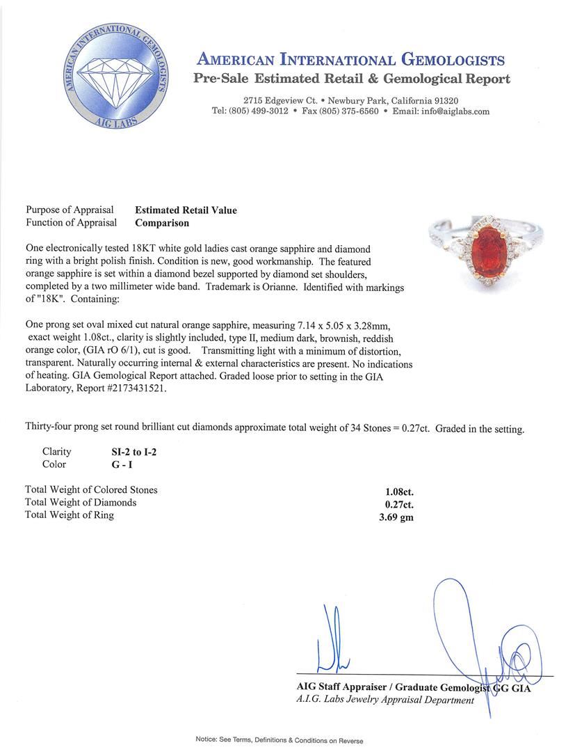 One electronically tested 18KT white gold ladies cast orange sapphire and diamond ring with a bright polish finish. The featured orange sapphire is set within a diamond bezel supported by diamond set shoulders, completed by a two millimeter wide band. Trademark is Orianne. Identified with markings of "18K". Condition is new, good workmanship. Containing: One prong set oval mixed cut natural orange sapphire, measuring 7.14 x 5.05 x 3.28mm, exact weight 1.08ct., clarity is slightly included, type II, medium dark, brownish, reddish orange color, (GIA rO 6/1), cut is good. Transmitting light with a minimum of distortion, transparent. Naturally occurring internal & external characteristics are present. No indications of heating. GIA Gemological Report attached. Graded loose prior to setting in the GIALaboratory, Report #2173431521.Thirty-Four prong set round brilliant cut diamonds approximate total weight of 34 Stones = 0.27ct. Graded in the setting. Clarity: SI-2 to I-2. Color: G - I. Total Weight of Colored Stones 1.08ct. Total Weight of Diamonds 0.27ct. Total Weight of Ring 3.69gm. AIG Appraised.