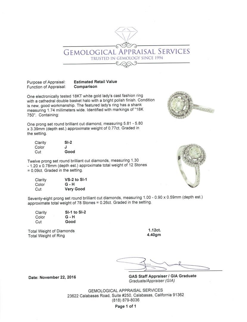 One electronically tested 18KT white gold lady's cast fashion ring with a cathedral double basket halo with a bright polish finish. The featured lady's ring has a shank measuring 1.74 millimeters wide. Identified with markings of "18K 750". Condition is new, good workmanship. Containing: One prong set round brilliant cut diamond, measuring 5.81 - 5.80 x 3.39mm (depth est.) approximate weight of 0.77ct. Graded in the setting. Clarity: SI-2. Color: JCut Good Twelve prong set round brilliant cut diamonds, measuring 1.30 - 1.20 x 0.78mm (depth est.) approximate total weight of 12 Stones = 0.09ct. Graded in the setting. Clarity: VS-2 to SI-1. Color: G - HCut Very Good Seventy-Eight prong set round brilliant cut diamonds, measuring 1.00 - 0.90 x 0.59mm (depth est.) approximate total weight of 78 Stones = 0.26ct. Graded in the setting. Clarity: SI-1 to SI-2. Color: G - HCut Good. Total Weight of Diamonds 1.12ct. Total Weight of Ring 4.40gm. GAS Appraised.