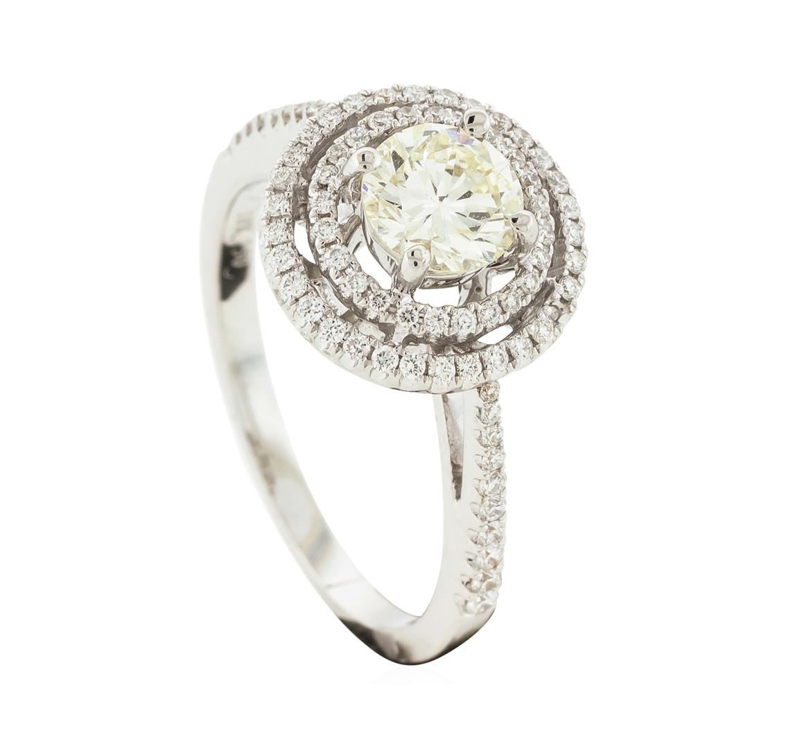 One electronically tested 18KT white gold lady's cast fashion ring with a cathedral double basket halo with a bright polish finish. The featured lady's ring has a shank measuring 1.74 millimeters wide. Identified with markings of "18K 750". Condition is new, good workmanship. Containing: One prong set round brilliant cut diamond, measuring 5.81 - 5.80 x 3.39mm (depth est.) approximate weight of 0.77ct. Graded in the setting. Clarity: SI-2. Color: JCut Good Twelve prong set round brilliant cut diamonds, measuring 1.30 - 1.20 x 0.78mm (depth est.) approximate total weight of 12 Stones = 0.09ct. Graded in the setting. Clarity: VS-2 to SI-1. Color: G - HCut Very Good Seventy-Eight prong set round brilliant cut diamonds, measuring 1.00 - 0.90 x 0.59mm (depth est.) approximate total weight of 78 Stones = 0.26ct. Graded in the setting. Clarity: SI-1 to SI-2. Color: G - HCut Good. Total Weight of Diamonds 1.12ct. Total Weight of Ring 4.40gm. GAS Appraised.