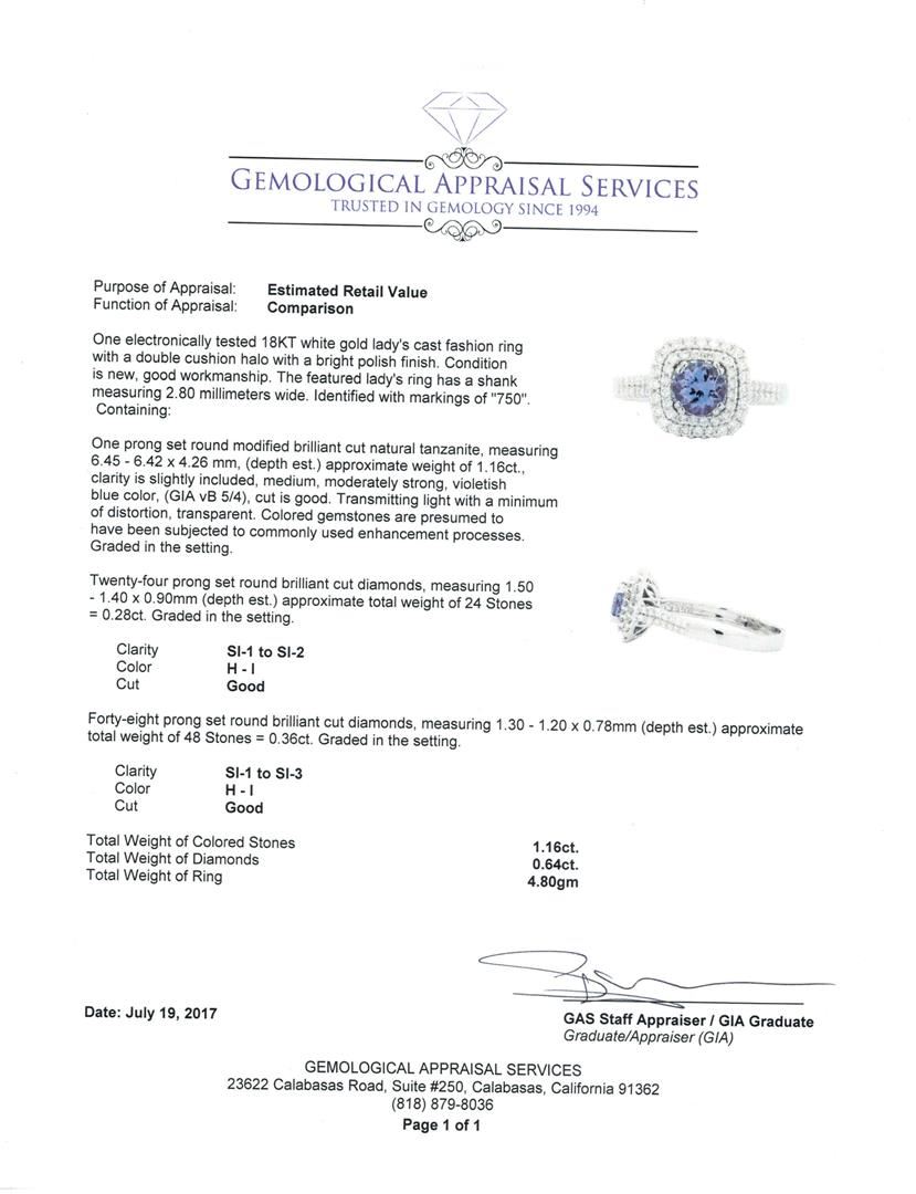 One electronically tested 18KT white gold Ladies cast fashion ring with a double cushion halo with a bright polish finish. The featured Ladies ring has a shank measuring 2.80 millimeters wide. Identified with markings of '750'. Condition is new, good workmanship. Containing: One prong set round modified brilliant cut natural tanzanite, measuring 6.45 - 6.42 x 4.26 mm, (depth est.) approximate weight of 1.16ct., clarity is slightly included, medium, moderately strong, violetish blue color, (GIA vB 5/4), cut is good. Transmitting light with a minimum of distortion, transparent. Colored gemstones are presumed to have been subjected to commonly used enhancement processes. Graded in the setting. Twenty-Four prong set round brilliant cut diamonds, measuring 1.50 - 1.40 x 0.90mm (depth est.) approximate total weight of 24 Stones = 0.28ct. Graded in the setting. Color H - I Clarity SI-1 to SI-2 Cut Good Forty-Eight prong set round brilliant cut diamonds, measuring 1.30 - 1.20 x 0.78mm (depth est.) approximate total weight of 48 Stones = 0.36ct. Graded in the setting. Color H - I Clarity SI-1 to SI-3 Cut Good. Total Weight of Colored Stones 1.16ct. Total Weight of Diamonds 0.64ct. Total Weight of Ring 4.80gm GAS Appraised.