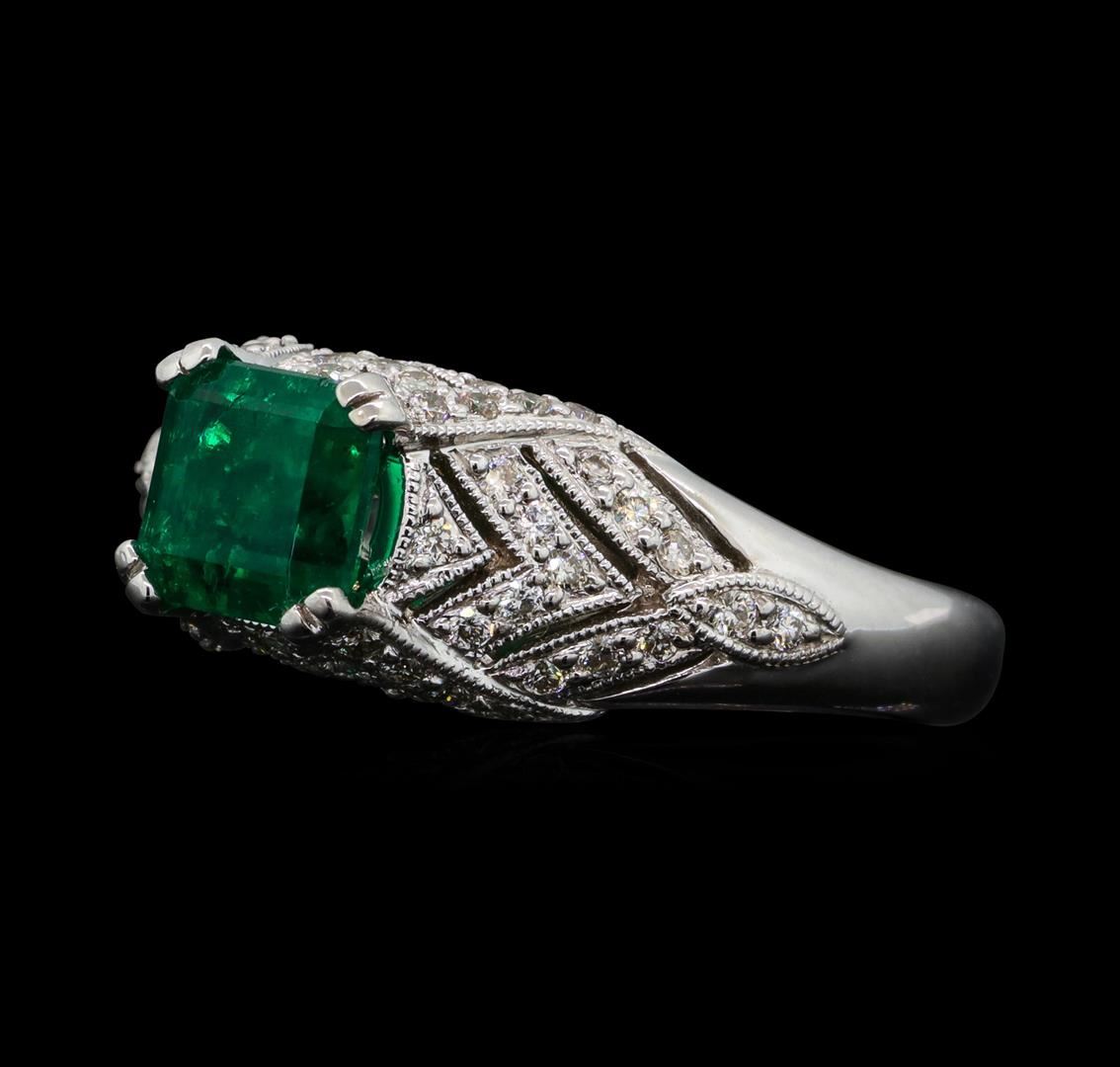 One electronically tested 18KT white gold lady's cast vintage style fashion ring with a cathedral shank with a bright polish with milgrain detailing finish. The featured lady's ring has a shank measuring 2.80 millimeters wide. Identified with markings of "18K". Condition is new, good workmanship. Containing: One prong set square standard step cut natural emerald, measuring 6.00 x 5.90 x 4.40mm, (depth est.) 5%. bulge factor, approximate weight of 1.20ct., clarity is moderately included, medium, strong, green color, (GIA G 5/5), cut is good. Transmitting light somewhat diffusely, transparent to translucent. Indications of oil residue. Naturally occurring internal & external characteristics are present. Colored gemstones are presumed to have been subjected to commonly used enhancement processes. Graded in the setting. Forty-Eight prong set round brilliant cut diamonds, measuring 1.40 - 1.35 x 0.86mm (depth est.) approximate total weight of 48 Stones = 0.50ct. Graded in the setting. Color H - I Clarity VS-2 to SI-1 Cut Good. Total Weight of Colored Stones 1.20ct. Total Weight of Diamonds 0.50ct. Total Weight of Ring 5.50gm. GAS Appraised.