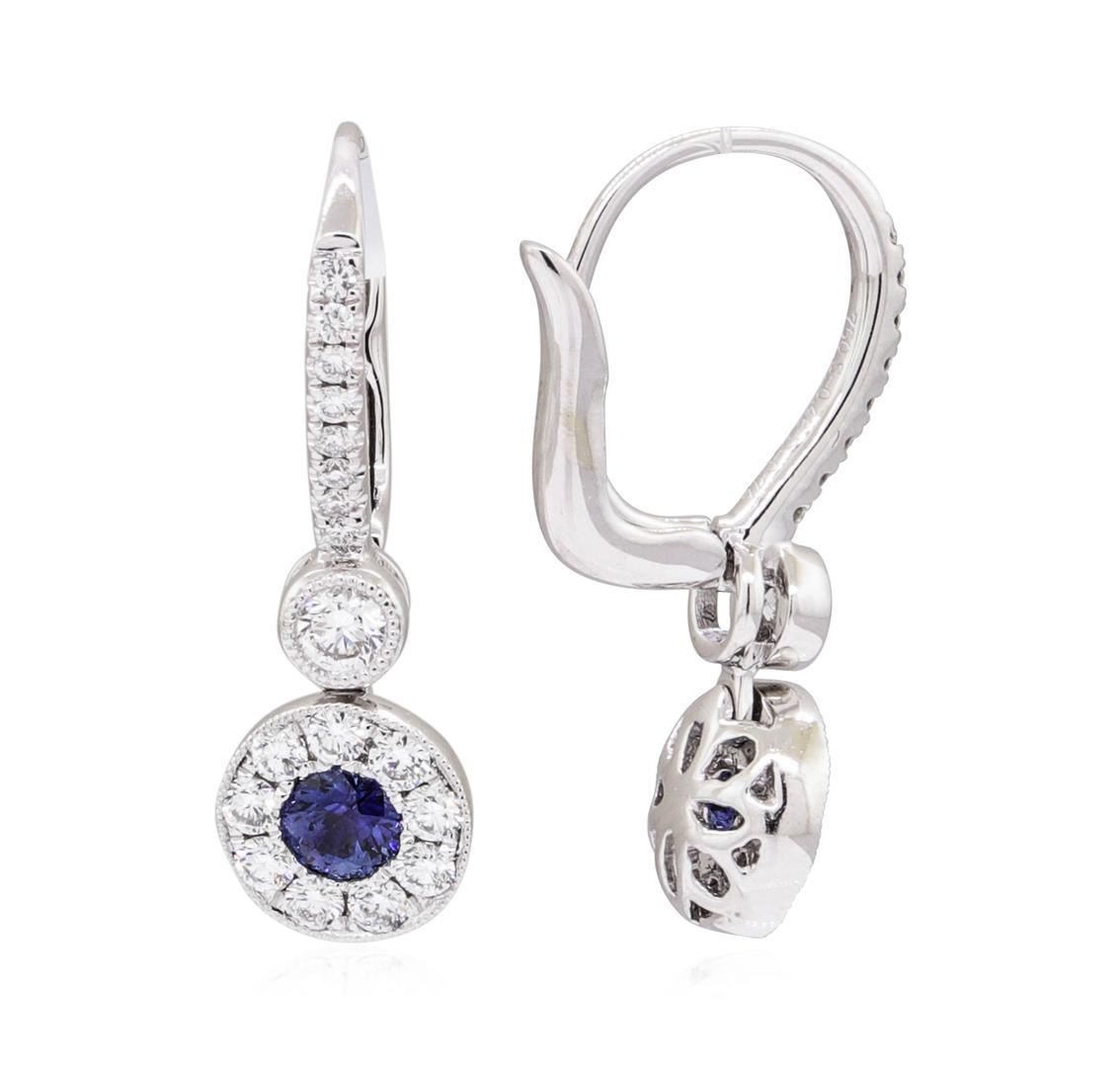 One pair electronically tested 18KT white gold lady's combination cast & assembled fashion dangle halo earrings with lever backs with a bright polish with milgrain detailing finish. The featured ladies earrings have a drop of 24 millimeters. Identified with markings of '750'. Condition is new, good workmanship. Containing: Two prong set round standard brilliant cut natural blue sapphires, measuring 3.70 - 3.65 x 2.24 mm, (depth est.) approximate total weight of 0.48ct.,, Clarity is eye clean, medium dark, strong, blue color, (GIA B 6/5), cut is very good. Colored gemstones are presumed to have been subjected to commonly used enhancement processes. Transmitting light with no distortion, transparent. Graded in the setting. Two bezel set round brilliant cut diamonds, measuring 3.00 - 2.95 x 1.83mm (depth est.) approximate total weight of 2 Stones = 0.20ct. Graded in the setting. Color G - H, Clarity VS-2 to SI-1 Cut Excellent Eighteen prong set round brilliant cut diamonds, measuring 1.85 - 1.80 x 1.14mm (depth est.) approximate total weight of 18 Stones = 0.44ct. Graded in the setting. Color G - H, Clarity VS-1 to VS-2, Cut Very Good Sixteen prong set round brilliant cut diamonds, measuring 1.25 - 1.20 x 0.74mm (depth est.) approximate total weight of 16 Stones = 0.10ct. Color G - H, Clarity VS-1 to VS-2, Cut Very Good. Total Weight of Colored Stones 0.48ct. Total Weight of Diamonds 0.74ct. Total Weight of Halo Earrings 4.50gm. GAS Appraised.