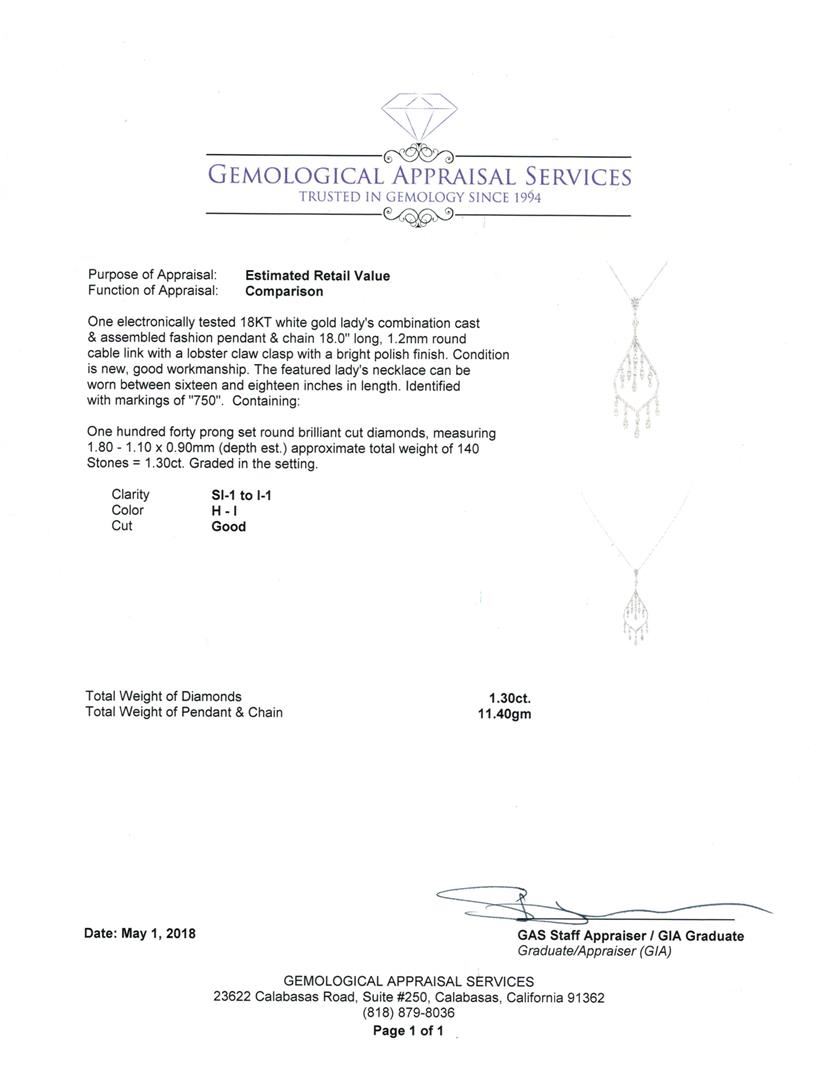 One electronically tested 18KT white gold Ladies combination cast & assembled fashion pendant & chain 18.0' long, 1.2mm round cable link with a lobster claw clasp with a bright polish finish. The featured Ladies necklace can be worn between sixteen and eighteen inches in length. Identified with markings of '750'. Condition is new, good workmanship. Containing: One Hundred Forty prong set round brilliant cut diamonds, measuring 1.80 - 1.10 x 0.90mm (depth est.) approximate total weight of 140 Stones = 1.30ct. Graded in the setting. Color H - I Clarity SI-1 to I-1 Cut Good. Total Weight of Diamonds 1.30ct.. Total Weight of Pendant & Chain 11.40gm. GAS Appraised.