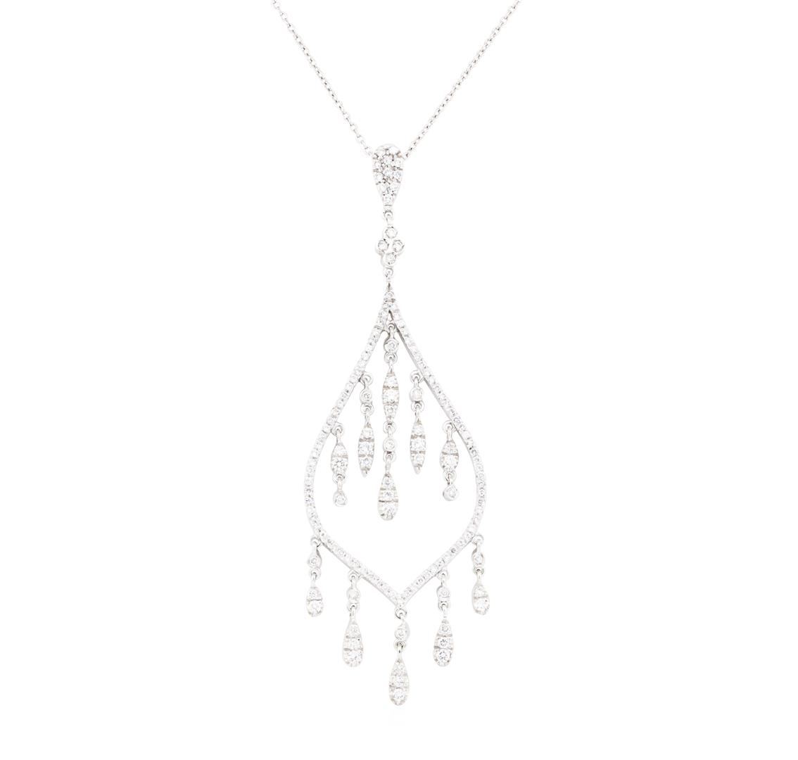 One electronically tested 18KT white gold Ladies combination cast & assembled fashion pendant & chain 18.0' long, 1.2mm round cable link with a lobster claw clasp with a bright polish finish. The featured Ladies necklace can be worn between sixteen and eighteen inches in length. Identified with markings of '750'. Condition is new, good workmanship. Containing: One Hundred Forty prong set round brilliant cut diamonds, measuring 1.80 - 1.10 x 0.90mm (depth est.) approximate total weight of 140 Stones = 1.30ct. Graded in the setting. Color H - I Clarity SI-1 to I-1 Cut Good. Total Weight of Diamonds 1.30ct.. Total Weight of Pendant & Chain 11.40gm. GAS Appraised.