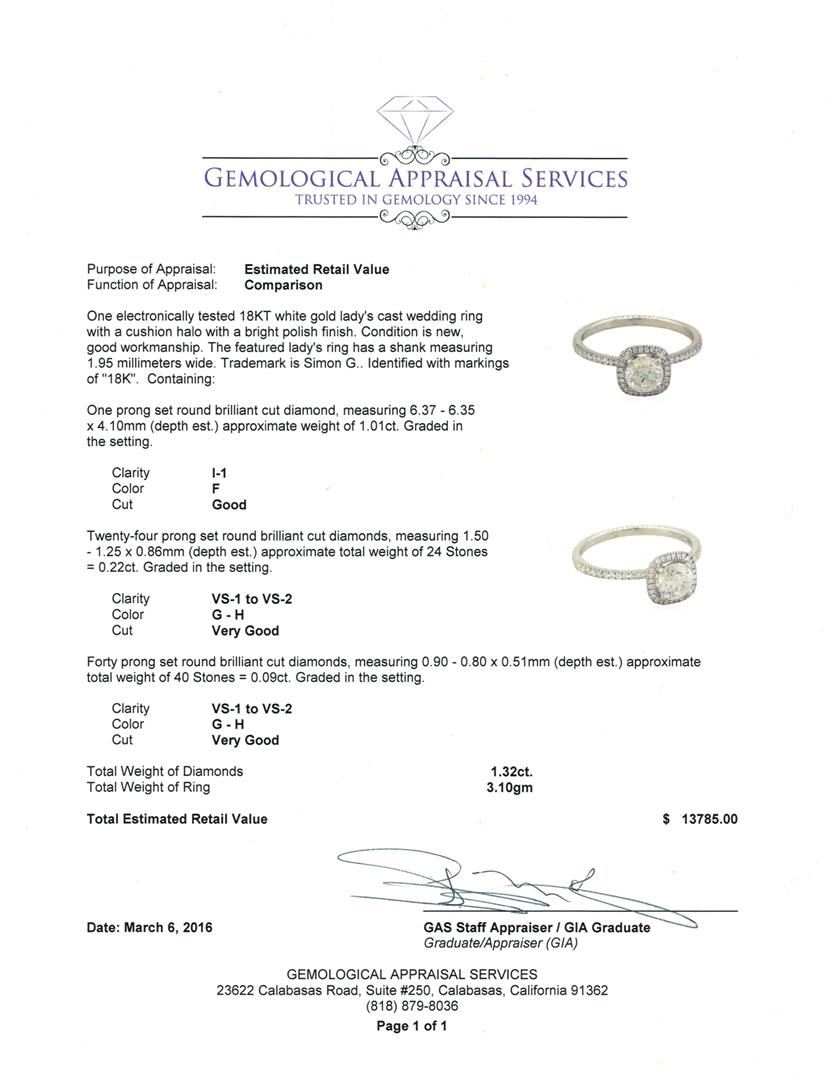 One electronically tested 18KT white gold lady's cast wedding ring with a cushion halo with a bright polish finish. The featured lady's ring has a shank measuring 1.95 millimeters wide. Trademark is Simon G. Identified with markings of "18K". Condition is new, good workmanship. Containing: One prong set round brilliant cut diamond, measuring 6.37 - 6.35 x 4.10mm (depth est.) approximate weight of 1.01ct. Graded in the setting. Clarity: I-1. Color: F, Cut Good. Twenty-Four prong set round brilliant cut diamonds, measuring 1.50 - 1.25 x 0.86mm (depth est.) approximate. Total Weight of 24 Stones = 0.22ct. Graded in the setting. Clarity: VS-1 to VS-2. Color: G - H, Cut Very Good. Forty prong set round brilliant cut diamonds, measuring 0.90 - 0.80 x 0.51mm (depth est.) approximate. Total Weight of 40 Stones = 0.09ct. Graded in the setting. Clarity: VS-1 to VS-2. Color: G - H, Cut Very Good. Total Weight of Diamonds 1.32ct. Total Weight of Ring 3.10 grams. GAS Appraised at $13,785.00.