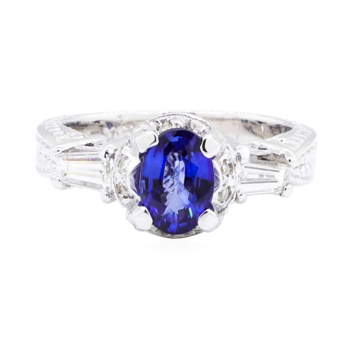 One electronically tested 18KT white gold lady's cast fashion ring with a bright polish, hand-engraved detail finish. The featured lady's ring has a shank measuring 3.00 millimeters wide. Identified with markings of '18K'. Condition is new, good workmanship. Containing: One prong set oval modified mixed cut natural blue sapphire, measuring 7.10 x 4.90 x 2.80mm, (depth est.) 5%. bulge factor, approximate weight of 0.88ct., clarity is eye clean, medium dark, moderately strong, violetish blue color, (GIA vB 6/4), cut is very good. Transmitting light with no distortion, transparent. Colored gemstones are presumed to have been subjected to commonly used enhancement processes. Graded in the setting. Two prong set baguette cut (tapered) diamonds, measuring from 4.05 x 2.40 x 2.04mm (depth est.) to 4.10 x 2.60 x 2.21mm (depth est.) approximate total weight of 2 Stones = 0.40ct. Graded in the setting. Color H - I Clarity VS-1 to VS-2 Cut Very Good Sixteen prong set round brilliant cut diamonds, measuring 1.20 - 1.00 x 0.68mm (depth est.) approximate total weight of 16 Stones = 0.08ct. Graded in the setting. Color I - L Clarity SI-2 to I-1 Cut Good. Total Weight of Colored Stones 0.88ct. Total Weight of Diamonds 0.48ct. Total Weight of Ring 5.10gm. GAS Appraised.