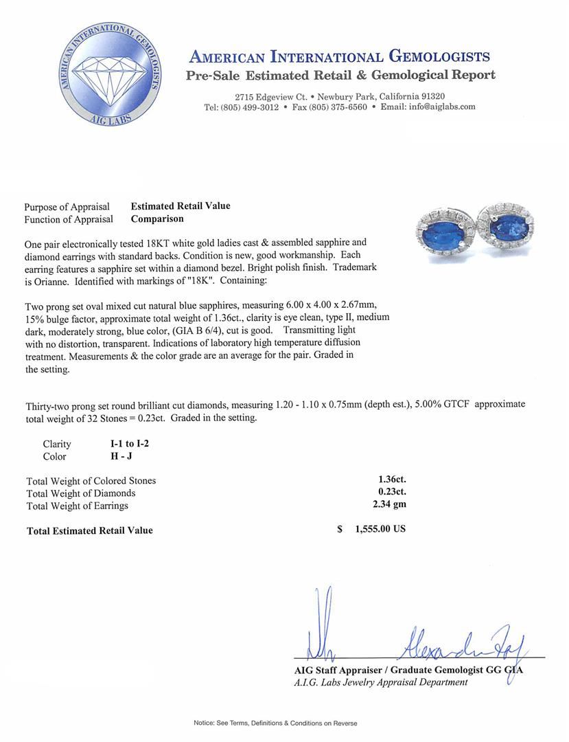 One pair electronically tested 18KT white gold ladies cast & assembled sapphire and diamond earrings with standard backs. Each earring features a sapphire set within a diamond bezel. Bright polish finish. Trademark is Orianne. Identified with markings of "18K". Condition is new, good workmanship. Containing: Two prong set oval mixed cut natural blue sapphires, measuring 6.00 x 4.00 x 2.67mm, 15%. bulge factor, approximate total weight of 1.36ct., clarity is eye clean, type II, medium dark, moderately strong, blue color, (GIA B 6/4), cut is good. Transmitting light with no distortion, transparent. Indications of laboratory high temperature diffusiontreatment. Measurements & the color grade are an average for the pair. Graded inthe setting.Thirty-Two prong set round brilliant cut diamonds, measuring 1.20 - 1.10 x 0.75mm (depth est.), 5.00.%. GTCF approximate total weight of 32 Stones = 0.23ct. Graded in the setting. Clarity: I-1 to I-2. Color: H - J. Total Weight of Colored Stones 1.36ct. Total Weight of Diamonds 0.23ct. Total Weight of Earrings 2.34gm. AIG Appraised at $1,555.00.
