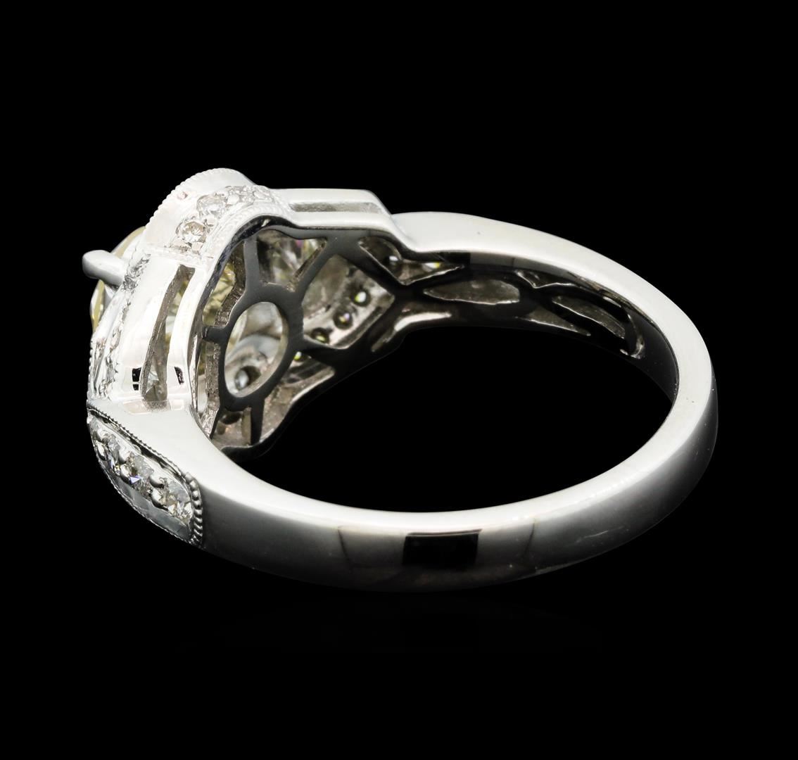 One electronically tested 18KT white gold lady's cast wedding ring with a scalloped cathedral halo with a bright polish with milgrain detailing finish. The featured lady's ring has a shank measuring 2.65 millimeters wide. Identified with markings of "18K 750". Condition is new, good workmanship. Containing: One prong set round brilliant cut diamond, measuring 5.60 - 5.58 x 3.50mm (depth est.) approximate weight of 0.70ct. Graded in the setting. Clarity: VS-1. Color: L - MCut Very Good Two bezel set half moon cut diamonds, measuring 3.60 x 2.80 x 1.78mm (depth est.) approximate total weight of 2 Stones = 0.30ct. Graded in the setting. Clarity: VS-2 to SI-1. Color: G - HCut Very Good Twelve prong set round brilliant cut diamonds, measuring 1.80 - 1.70 x 1.09mm (depth est.) approximate total weight of 12 Stones = 0.25ct. Graded in the setting. Clarity: SI-1 to SI-2. Color: H - ICut Good Twenty-Four prong set round brilliant cut diamonds, measuring 1.20 - 1.10 x 0.71mm (depth est.) approximate total weight of 24 Stones = 0.15ct. Graded in the setting. Clarity: SI-1 to SI-2. Color: H - ICut Good. Total Weight of Diamonds 1.40ct. Total Weight of Ring 6.10gm. GAS Appraised.