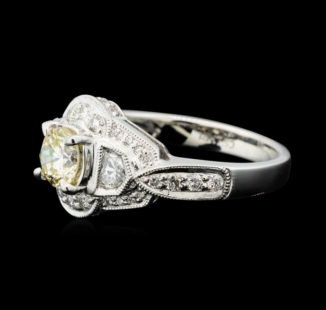 One electronically tested 18KT white gold lady's cast wedding ring with a scalloped cathedral halo with a bright polish with milgrain detailing finish. The featured lady's ring has a shank measuring 2.65 millimeters wide. Identified with markings of "18K 750". Condition is new, good workmanship. Containing: One prong set round brilliant cut diamond, measuring 5.60 - 5.58 x 3.50mm (depth est.) approximate weight of 0.70ct. Graded in the setting. Clarity: VS-1. Color: L - MCut Very Good Two bezel set half moon cut diamonds, measuring 3.60 x 2.80 x 1.78mm (depth est.) approximate total weight of 2 Stones = 0.30ct. Graded in the setting. Clarity: VS-2 to SI-1. Color: G - HCut Very Good Twelve prong set round brilliant cut diamonds, measuring 1.80 - 1.70 x 1.09mm (depth est.) approximate total weight of 12 Stones = 0.25ct. Graded in the setting. Clarity: SI-1 to SI-2. Color: H - ICut Good Twenty-Four prong set round brilliant cut diamonds, measuring 1.20 - 1.10 x 0.71mm (depth est.) approximate total weight of 24 Stones = 0.15ct. Graded in the setting. Clarity: SI-1 to SI-2. Color: H - ICut Good. Total Weight of Diamonds 1.40ct. Total Weight of Ring 6.10gm. GAS Appraised.