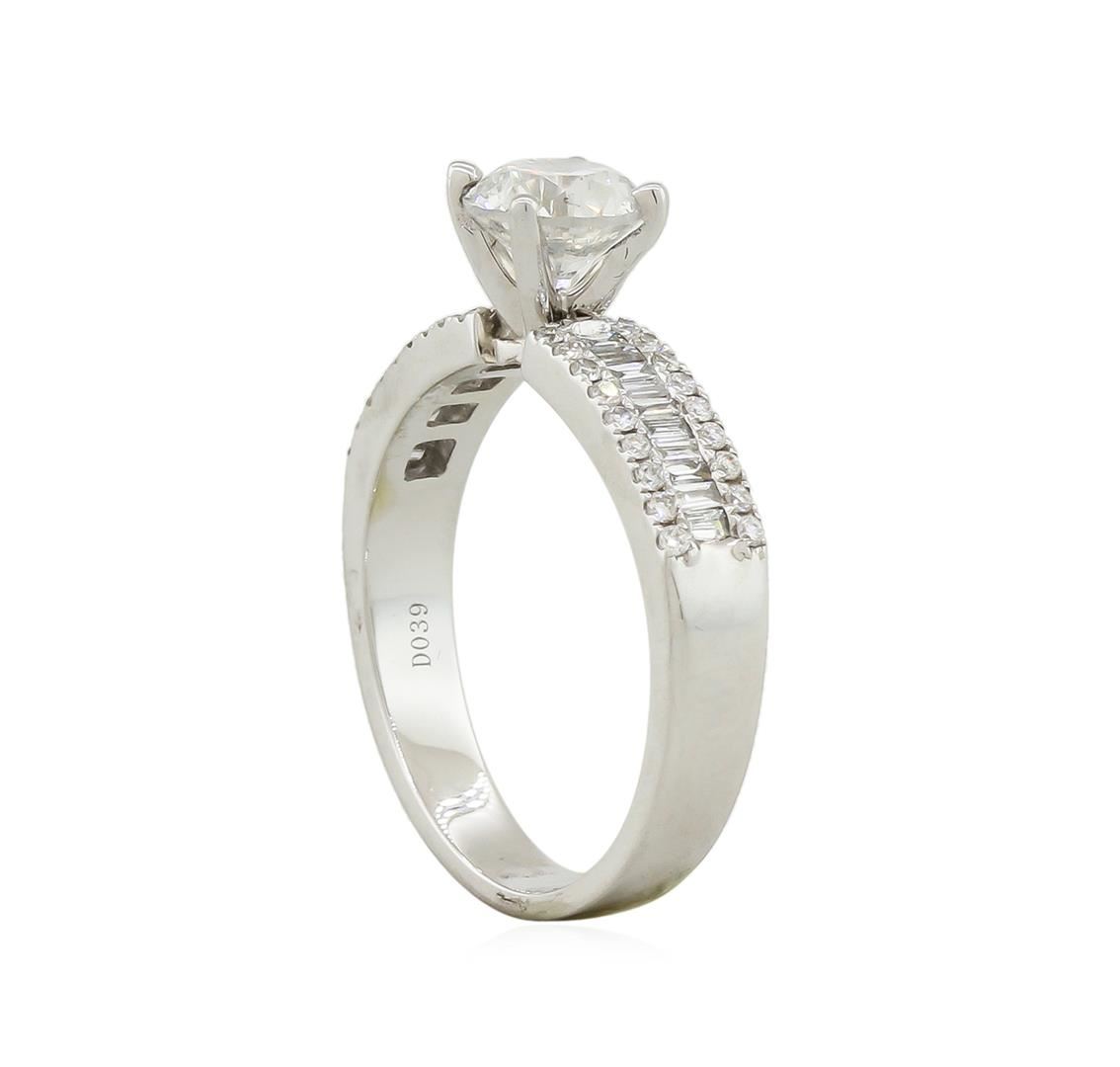 One electronically tested 18KT white gold ladies cast diamond unity ring with a bright polish finish. The featured diamond is supported by diamond ribbon shoulders, completed by a three millimeter wide band. Identified with markings of "18K 750". Condition is new, good workmanship. Containing: One prong set round brilliant cut diamond, measuring 6.10 - 6.10 x 4.00mm (depth est.), 7.00.%. GTCF approximate weight of 1.01ct with a faint yellow fluorescence. Graded in the setting. Clarity: I-1. Color: GDepth 65.6%. Table 57.4%. Fifty-Six prong & channel set round brilliant & baguette cut diamonds approximate. Total Weight of 56 Stones = 0.39ct. Graded in the setting. Clarity: VS-1 to SI-1. Color: F - H. Total Weight of Diamonds 1.40ct. Total Weight of Ring 4.62gm. AIG Appraised at $16,390.00.