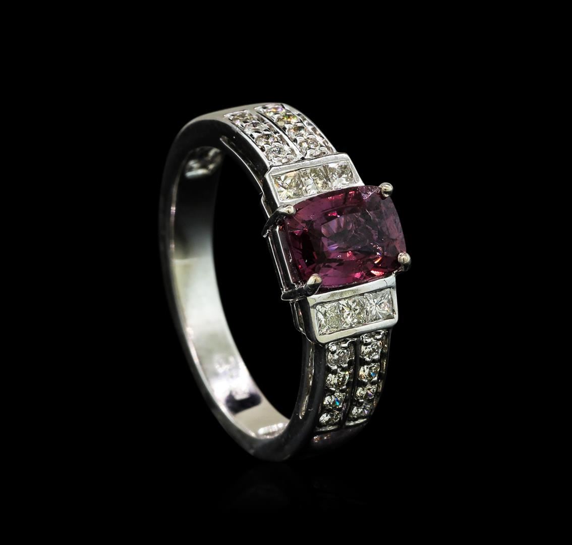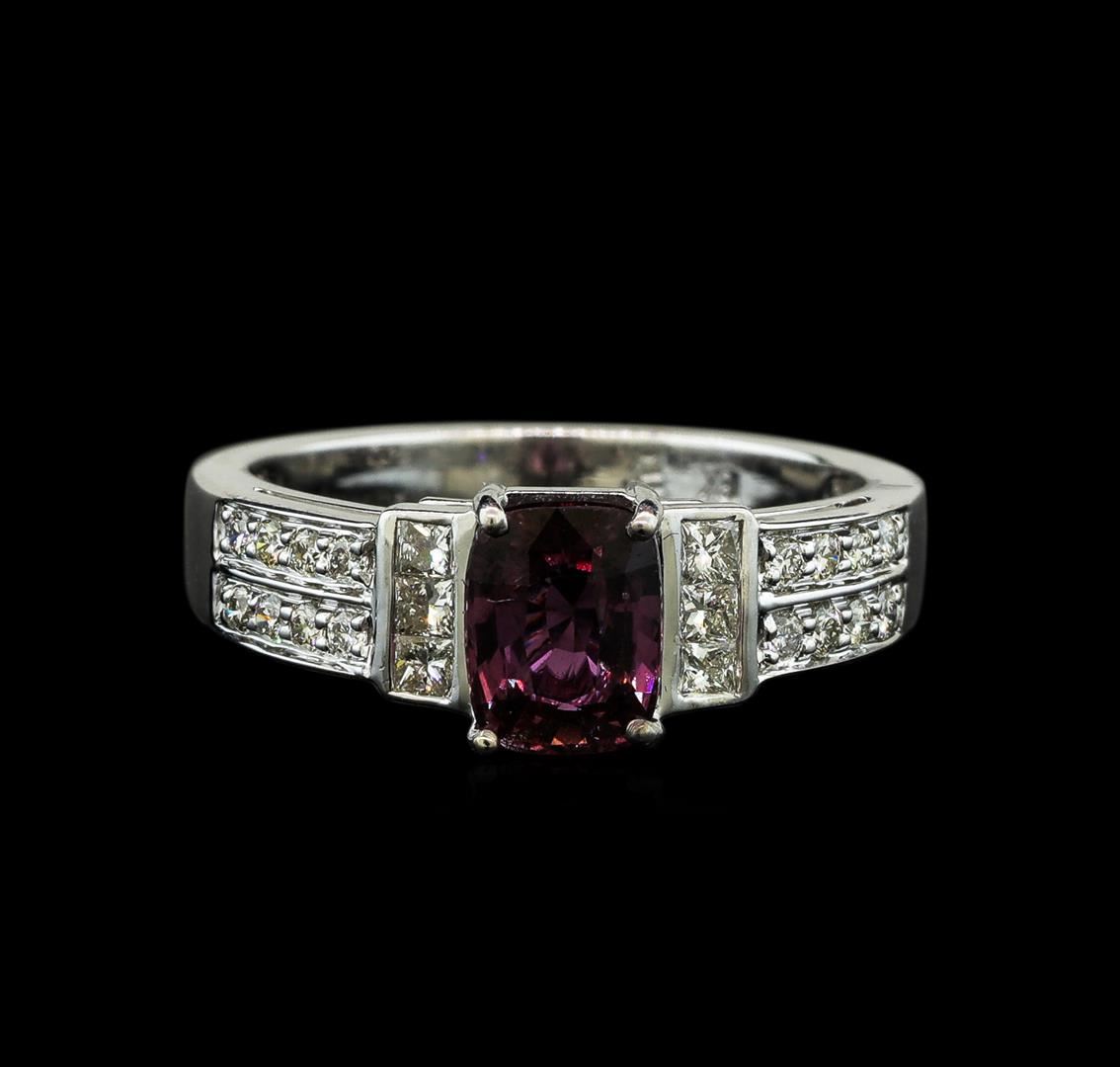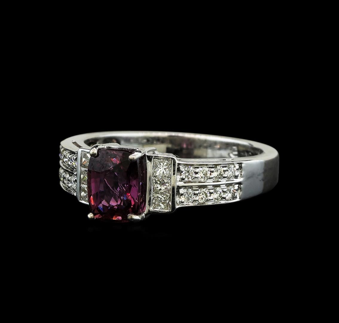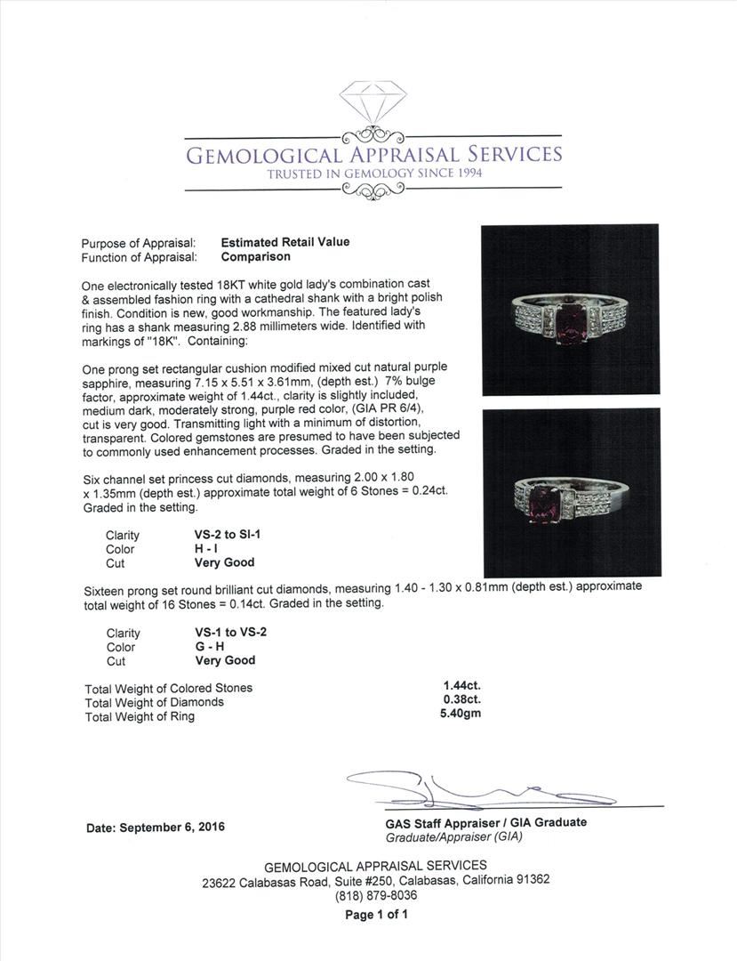 One electronically tested 18KT white gold lady's combination cast & assembled fashion ring with a cathedral shank with a bright polish finish. The featured lady's ring has a shank measuring 2.88 millimeters wide. Identified with markings of "18K". Condition is new, good workmanship. Containing: One prong set rectangular cushion modified mixed cut natural purple sapphire, measuring 7.15 x 5.51 x 3.61mm, (depth est.) 7%. bulge factor, approximate weight of 1.44ct., clarity is slightly included, medium dark, moderately strong, purple red color, (GIA PR 6/4), cut is very good. Transmitting light with a minimum of distortion, transparent. Colored gemstones are presumed to have been subjected to commonly used enhancement processes. Graded in the setting.Six channel set princess cut diamonds, measuring 2.00 x 1.80 x 1.35mm (depth est.) approximate total weight of 6 Stones = 0.24ct. Graded in the setting. Clarity: VS-2 to SI-1. Color: H - ICut Very Good Sixteen prong set round brilliant cut diamonds, measuring 1.40 - 1.30 x 0.81mm (depth est.) approximate total weight of 16 Stones = 0.14ct. Graded in the setting. Clarity: VS-1 to VS-2. Color: G - HCut Very Good. Total Weight of Colored Stones 1.44ct. Total Weight of Diamonds 0.38ct. Total Weight of Ring 5.40gm. GAS Appraised.