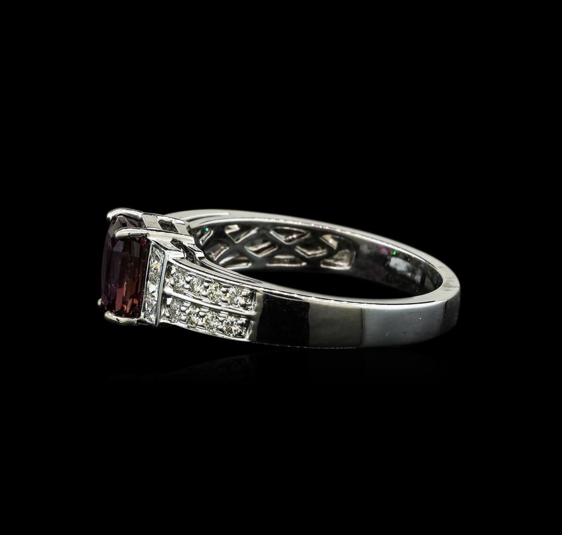 One electronically tested 18KT white gold lady's combination cast & assembled fashion ring with a cathedral shank with a bright polish finish. The featured lady's ring has a shank measuring 2.88 millimeters wide. Identified with markings of "18K". Condition is new, good workmanship. Containing: One prong set rectangular cushion modified mixed cut natural purple sapphire, measuring 7.15 x 5.51 x 3.61mm, (depth est.) 7%. bulge factor, approximate weight of 1.44ct., clarity is slightly included, medium dark, moderately strong, purple red color, (GIA PR 6/4), cut is very good. Transmitting light with a minimum of distortion, transparent. Colored gemstones are presumed to have been subjected to commonly used enhancement processes. Graded in the setting.Six channel set princess cut diamonds, measuring 2.00 x 1.80 x 1.35mm (depth est.) approximate total weight of 6 Stones = 0.24ct. Graded in the setting. Clarity: VS-2 to SI-1. Color: H - ICut Very Good Sixteen prong set round brilliant cut diamonds, measuring 1.40 - 1.30 x 0.81mm (depth est.) approximate total weight of 16 Stones = 0.14ct. Graded in the setting. Clarity: VS-1 to VS-2. Color: G - HCut Very Good. Total Weight of Colored Stones 1.44ct. Total Weight of Diamonds 0.38ct. Total Weight of Ring 5.40gm. GAS Appraised.