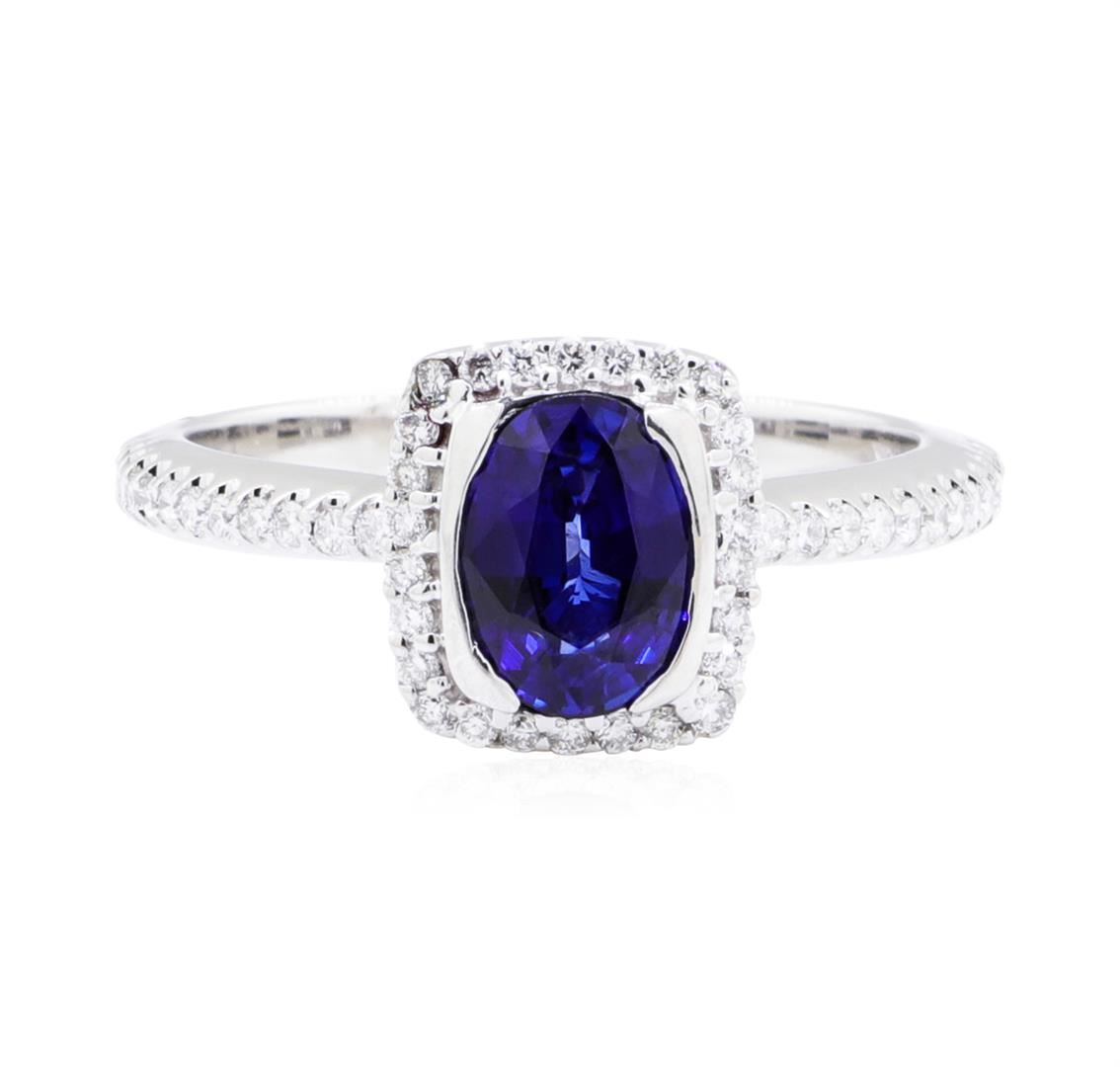 One electronically tested 18KT white gold lady's cast fashion ring with a cushion halo with a bright polish finish. The featured lady's ring has a shank measuring 2.35 millimeters wide. Identified with markings of '18K 750'. Condition is new, good workmanship. Containing: One half bezel set oval modified mixed cut natural blue sapphire, measuring 7.50 x 5.50 x 3.40mm, (depth est.) approximate weight of 1.18ct., clarity is eye clean, medium dark, moderately strong, blue color, (GIA B 6/4), cut is very good. Transmitting light with no distortion, transparent. Colored gemstones are presumed to have been subjected to commonly used enhancement processes. Graded in the setting. Fifty prong set round brilliant cut diamonds, measuring 1.25 - 1.10 x 0.73mm (depth est.) approximate total weight of 50 Stones = 0.31ct. Graded in the setting. Color G - H Clarity SI-1 to SI-2 Cut Very Good. Total Weight of Colored Stones 1.18ct. Total Weight of Diamonds 0.31ct. Total Weight of Ring 4.90gm. GAS Appraised.