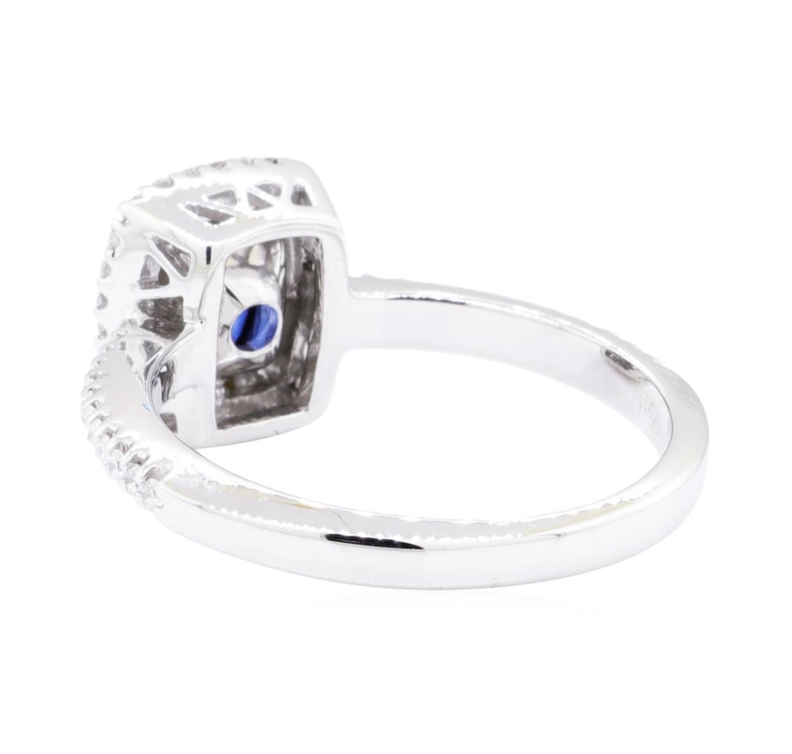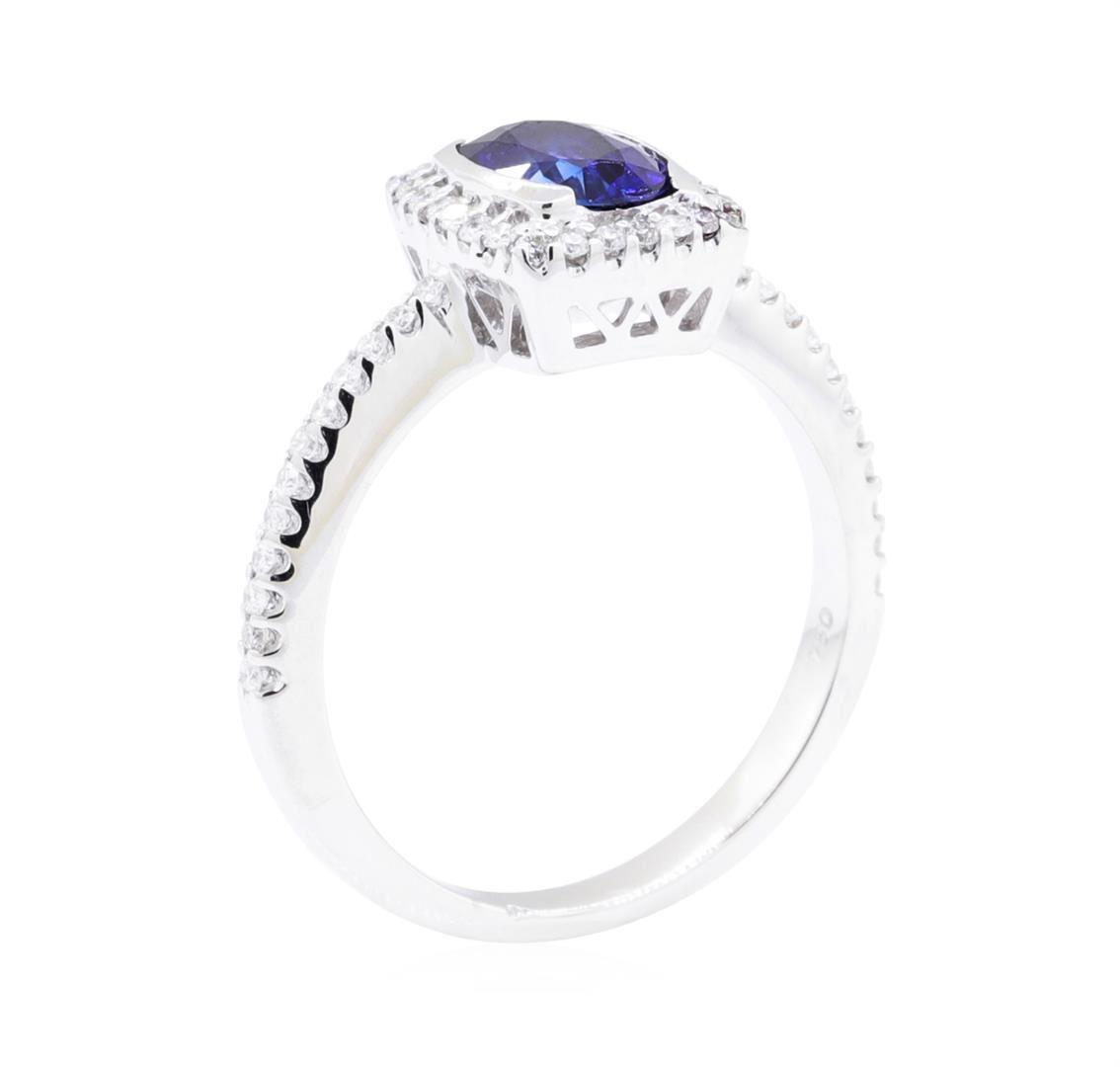 One electronically tested 18KT white gold lady's cast fashion ring with a cushion halo with a bright polish finish. The featured lady's ring has a shank measuring 2.35 millimeters wide. Identified with markings of '18K 750'. Condition is new, good workmanship. Containing: One half bezel set oval modified mixed cut natural blue sapphire, measuring 7.50 x 5.50 x 3.40mm, (depth est.) approximate weight of 1.18ct., clarity is eye clean, medium dark, moderately strong, blue color, (GIA B 6/4), cut is very good. Transmitting light with no distortion, transparent. Colored gemstones are presumed to have been subjected to commonly used enhancement processes. Graded in the setting. Fifty prong set round brilliant cut diamonds, measuring 1.25 - 1.10 x 0.73mm (depth est.) approximate total weight of 50 Stones = 0.31ct. Graded in the setting. Color G - H Clarity SI-1 to SI-2 Cut Very Good. Total Weight of Colored Stones 1.18ct. Total Weight of Diamonds 0.31ct. Total Weight of Ring 4.90gm. GAS Appraised.