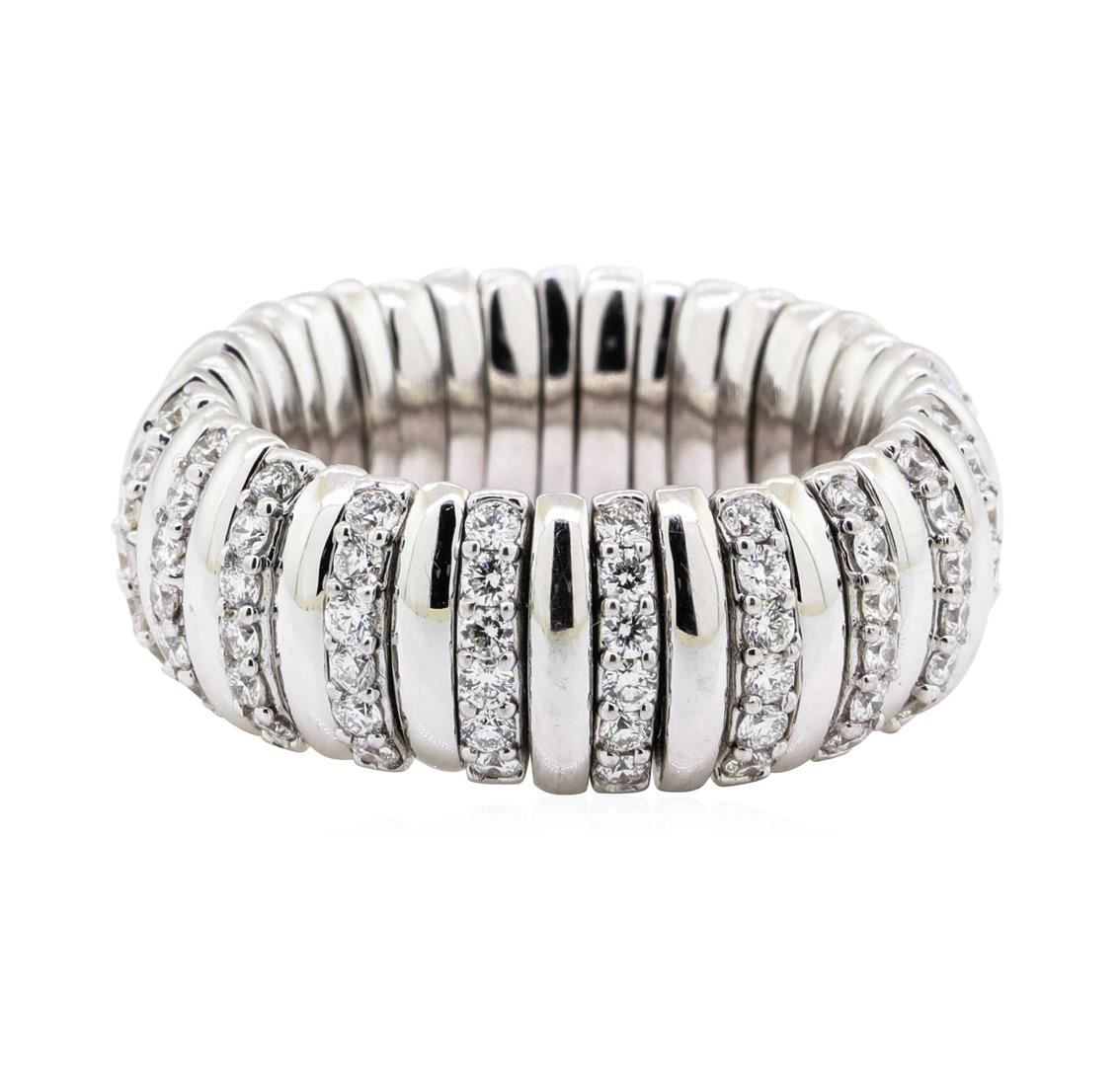 One electronically tested 18KT white gold Ladies combination cast & assembled fashion stretch band with a bright polish finish. The featured Ladies ring has a shank measuring 8.40 millimeters wide. Identified with markings of '750'. Condition is new, good workmanship. Containing: One Hundred Twenty prong set round brilliant cut diamonds, measuring 1.50 - 1.45 x 0.92mm (depth est.) approximate total weight of 120 Stones = 1.50ct. Graded in the setting. Color H - I Clarity SI-1 to SI-2 Cut Good. Total Weight of Diamonds 1.50ct.. Total Weight of Stretch Band 13.90gm. GAS Appraised.