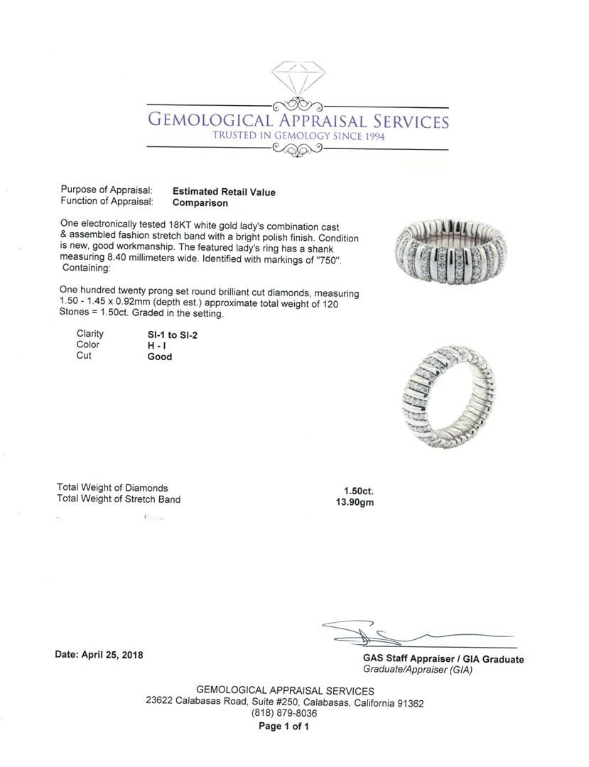 One electronically tested 18KT white gold Ladies combination cast & assembled fashion stretch band with a bright polish finish. The featured Ladies ring has a shank measuring 8.40 millimeters wide. Identified with markings of '750'. Condition is new, good workmanship. Containing: One Hundred Twenty prong set round brilliant cut diamonds, measuring 1.50 - 1.45 x 0.92mm (depth est.) approximate total weight of 120 Stones = 1.50ct. Graded in the setting. Color H - I Clarity SI-1 to SI-2 Cut Good. Total Weight of Diamonds 1.50ct.. Total Weight of Stretch Band 13.90gm. GAS Appraised.