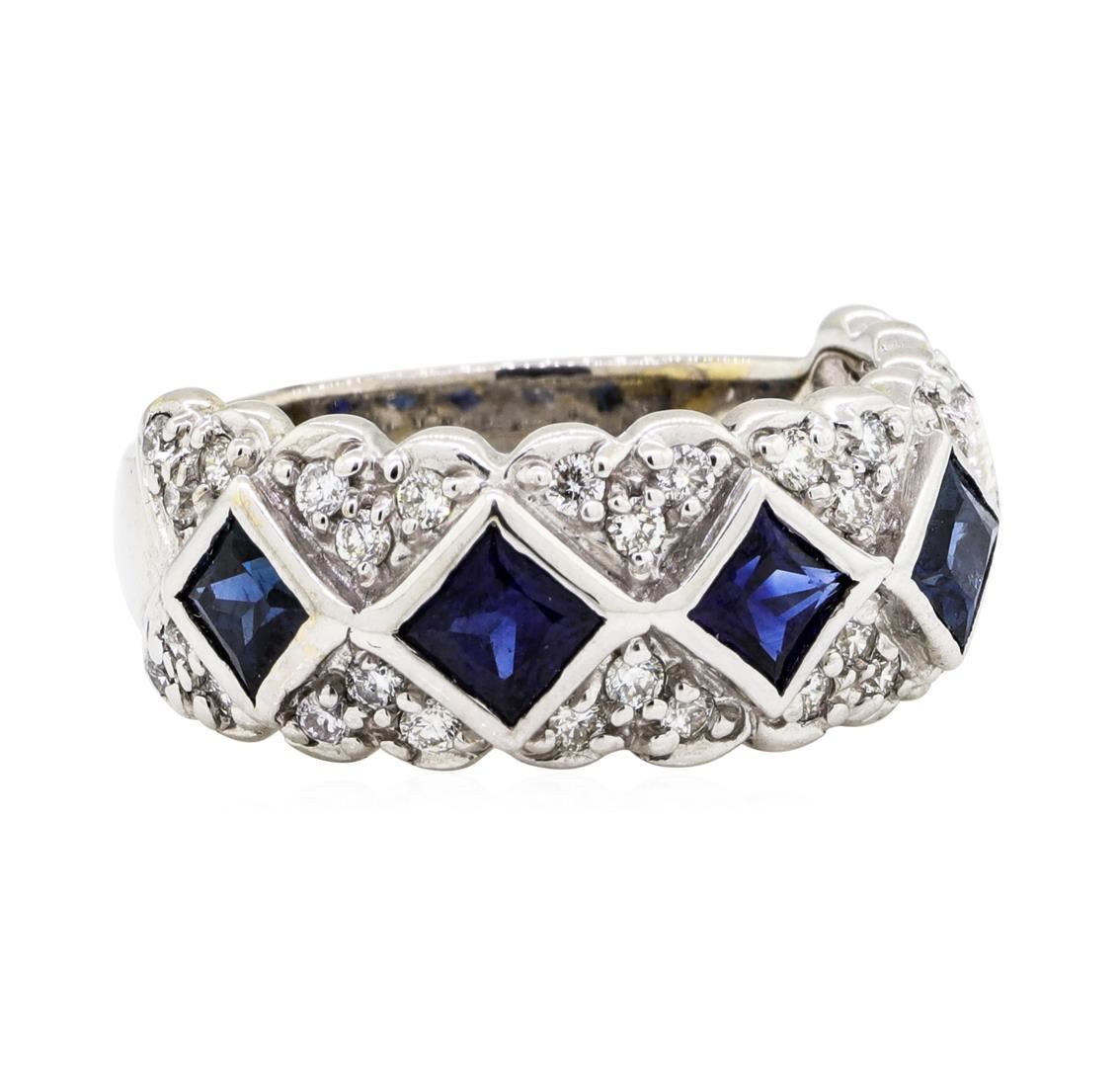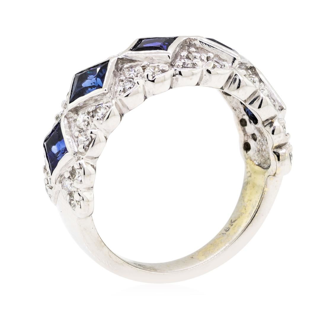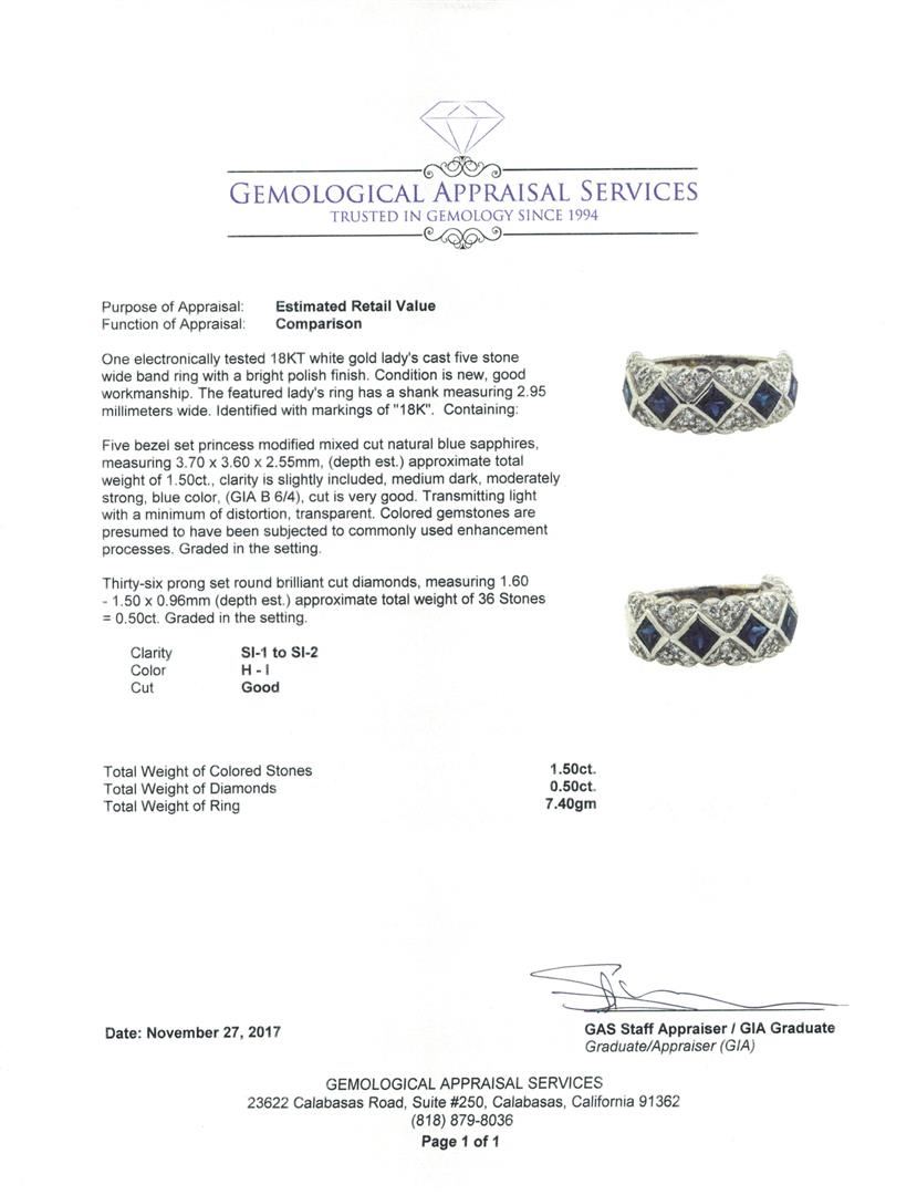 One electronically tested 18KT white gold lady's cast five stone wide band ring with a bright polish finish. The featured lady's ring has a shank measuring 2.95 millimeters wide. Identified with markings of '18K'. Condition is new, good workmanship. Containing: Five bezel set princess modified mixed cut natural blue sapphires, measuring 3.70 x 3.60 x 2.55mm, (depth est.) approximate total weight of 1.50ct., clarity is slightly included, medium dark, moderately strong, blue color, (GIA B 6/4), cut is very good. Transmitting light with a minimum of distortion, transparent. Colored gemstones are presumed to have been subjected to commonly used enhancement processes. Graded in the setting. Thirty-Six prong set round brilliant cut diamonds, measuring 1.60 - 1.50 x 0.96mm (depth est.) approximate total weight of 36 Stones = 0.50ct. Graded in the setting. Color H - I Clarity SI-1 to SI-2 Cut Good. Total Weight of Colored Stones 1.50ct.. Total Weight of Diamonds 0.50ct.. Total Weight of Ring 7.40gm. GAS Appraised.
