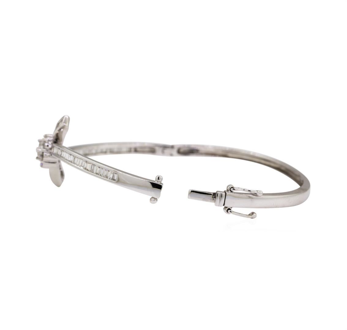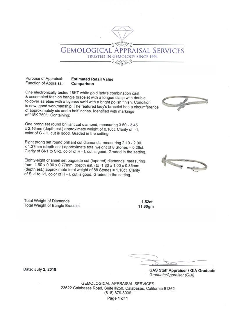 One electronically tested 18KT white gold lady's combination cast & assembled fashion bangle bracelet with a tongue clasp with double foldover safeties with a bypass swirl with a bright polish finish. The featured lady's bracelet has a circumference of approximately six and a half inches. Identified with markings of '18K 750'. Condition is new, good workmanship. Containing: One prong set round brilliant cut diamond, measuring 3.50 - 3.45 x 2.16mm (depth est.) approximate weight of 0.16ct. Graded in the setting. Color G - H Clarity I-1 Cut Good Eight prong set round brilliant cut diamonds, measuring 2.10 - 2.00 x 1.27mm (depth est.) approximate total weight of 8 Stones = 0.26ct. Graded in the setting. Color H - I Clarity SI-1 to SI-2 Cut Good Eighty-Eight channel set baguette cut (tapered) diamonds, measuring from 1.60 x 0.90 x 0.77mm (depth est.) to 1.80 x 1.00 x 0.85mm (depth est.) approximate total weight of 88 Stones = 1.10ct. Graded in the setting. Color H - I Clarity SI-1 to I-1 Cut Good. Total Weight of Diamonds 1.52ct. Total Weight of Bangle Bracelet 11.60gm. GAS Appraised.